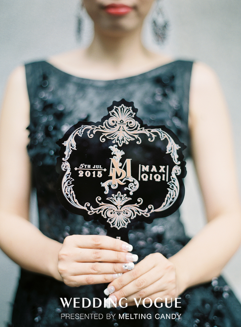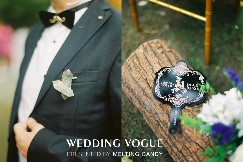 新郎的胸针由两颗原石以不规则的方式斜街在一起,依然采用最原始的方式,用铜丝将其固定,主题色彩非常浓厚。考虑到夏季炎热的缘故,新人还特意为来宾准备了扇子,而很有爱MeltingCandy在扇子的设计上,采用主题LOGO的图案进行呈现,色彩的选择上也采用主题色黑色。