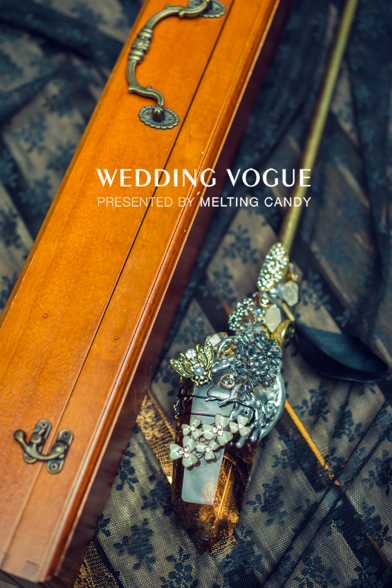 这次的手捧花区别于常规的设计,造型是一柄权杖,材质选用水晶石的元素,配合整体的婚品设计,颜色选用黑色。黑色水晶石本身亦有着净化心灵,为爱守护的寓意。这只手捧独特而且意义非凡,但制作过程却异常艰辛,为了自然焊接水晶石与手杖,很有爱MeltingCandy尝试了高难度的焊锡,这种原始的制作过程,是在450摄氏度的高温下,将锡条融成锡水后浇灌在材质之间。这么做,只是为了让整个权杖看起来更加自然,而婚礼当天手持这柄权杖的新娘如女王一般,主宰自己的爱情。