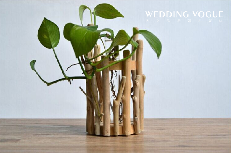 为配合《光合作用》主题,新锐艺术婚礼在桌花设计上,使用了手工制作的木质花器,并在其中心部分放入电子蜡烛呈现光源,同时还将隐蔽的插入一根试管种植水培植物。