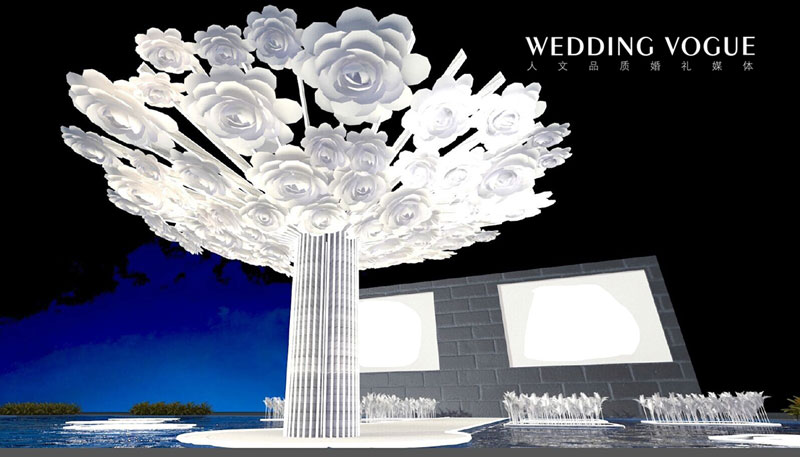 用木片组装而成的抽象白色大树,以LED灯带勾勒出树干和树枝的线条,做出内外发光的通透效果。树枝朝下的部分使用手工纯白玫瑰做倒掉装饰,同时在玫瑰花的缝隙之间悬挂白色水滴玻璃瓶,以增加其灵动视觉。