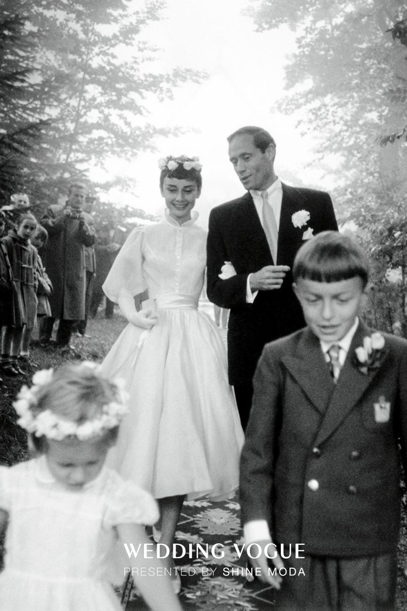 好莱坞影星奥黛丽•赫本与男演员Mel Ferrer在出演百老汇歌剧《水中仙》时相识,并于1954年9月举办婚礼。奥黛丽•赫本身穿一件典型五十年代芭蕾舞裙风格的长裙婚纱,并在头上佩戴了玫瑰。轻松演绎时髦新娘应该选择你最喜欢的那条裙子结婚。