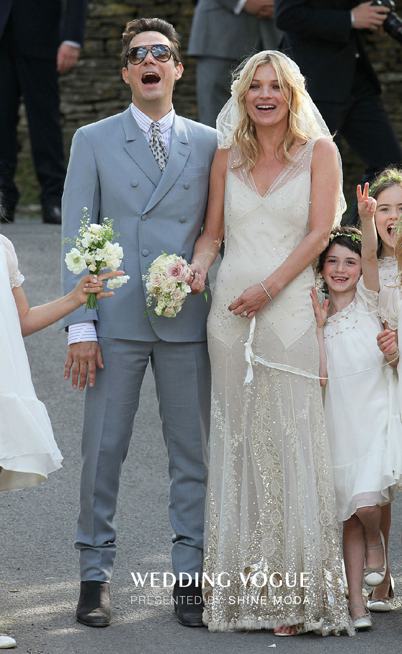 Kate Moss在英国绍斯洛普村的教堂与Jamie Hince举办了婚礼, Kate Moss说道:“我非常想要一件纯粹的的婚纱,30年代的雪纺风格的那种。她是明确知道自己想要什么的时髦摩登新娘。