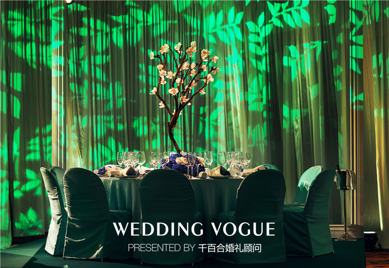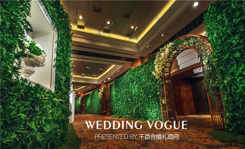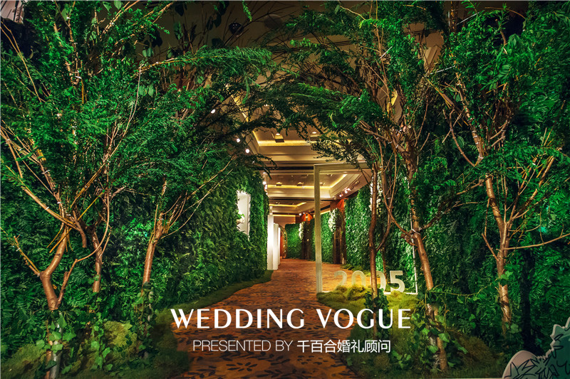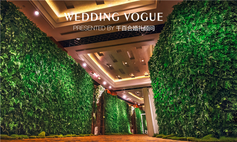 千百合最大的愿望就是宾客能在这场秀中体验到美好的氛围,所以在细节布置上,可谓细致入微,用心良苦。现场的来宾一定注意到,婚礼秀现场四周用白色纱幔包围,碧绿的灯光开启,一片片碧绿的树叶显现了出来。俞少军花了很多的精力来布置灯光,就是为了表达墙面森林的感觉。通过采用极简的包豪斯风格,使得绿植的墙面既能呈现更自然的线条,又很整齐,不琐碎。“用灯光在巨大的纱幔上做展示,让现场的来宾进入现场时依然能够感受到森系的氛围”,俞少军没有选用常规的碧绿色布幔打底,这虽然是最简单的方法,但却不能更好地呈现光影,选择素色布幔呈现光影,给了宾客更多的想象空间。而入口处的拱形原木门,俞少军设置了手绘的感觉,表达虚实结合。“我们做了这么多年婚礼秀,这是第一次花最多的精力做花艺这一块,”俞少军表达了千百合对本次十周年婚礼秀的重视。