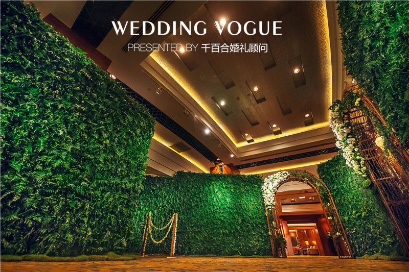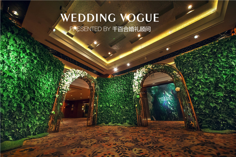 踏入凯悦酒店地下二层,映入眼帘的是一条绿色走廊。纯白与翠绿的花艺装饰,瞬间让人心旷神怡。绿色走廊尽头是棕色原木布置的原形拱门,好似一个绿色城堡。跟随着工作人员的引导,宾客们渐次踏入了婚礼秀主场,清凉的帘雾喷薄而出,如同置身仙境。跨越莲雾,才发现自己站在主舞台的最中央。“让所有宾客通过舞台来到座位上,是特别的设计。就是让大家知道,舞台不是主持人和新人的专属,所有来到现场的嘉宾都是未来某一天的新娘、新郎,他们一定会走上舞台,站在聚光灯下”。本场婚礼秀的策划师俞少军告诉婚礼风尚,之所以这样设置舞台,就是希望每位来宾都能感受到自己站在舞台上的感觉,让他们享受这种美好的体验。同时通过这样的设计,也改变了酒店的整体格局,给人带来新鲜感。