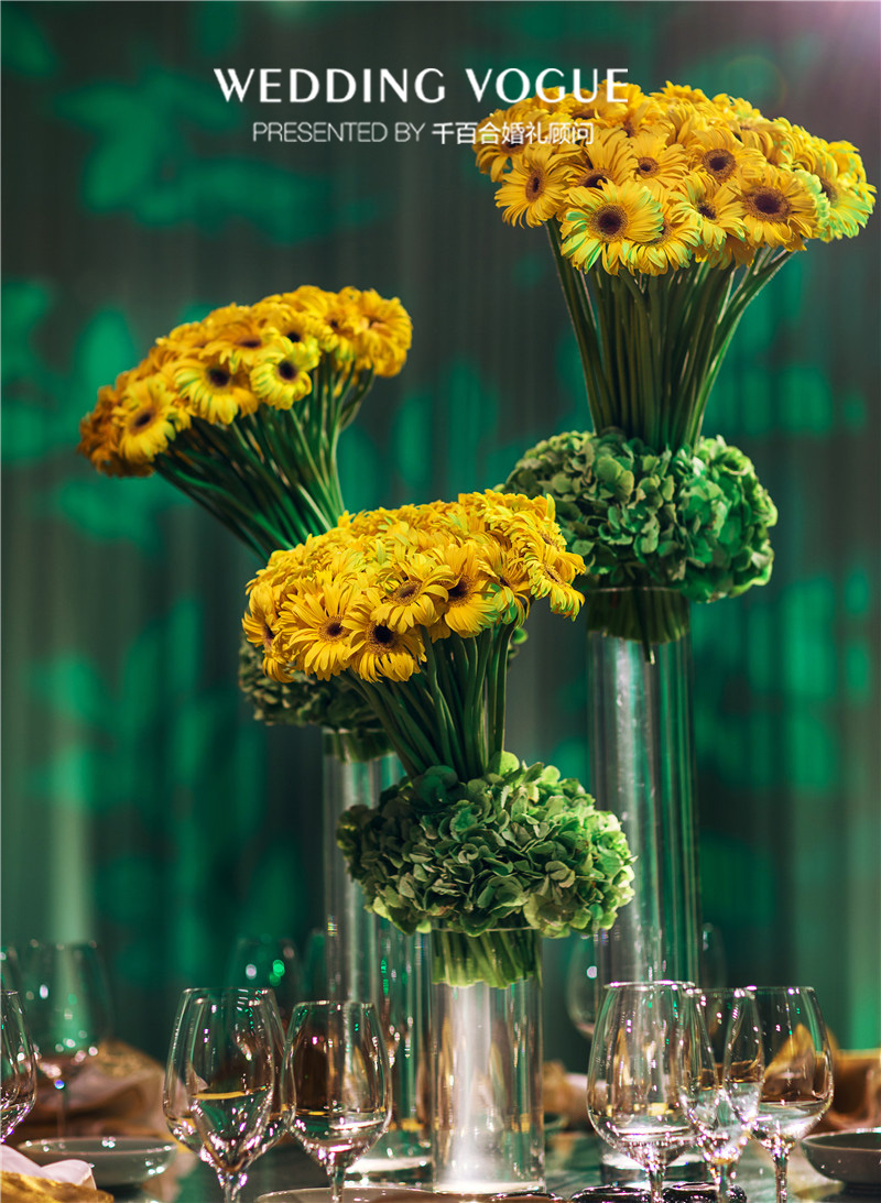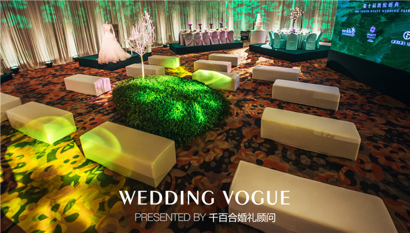 游弋于现场,目光所及之处,无不是翠色欲滴。桌上的白花被小心翼翼地用旧报纸包裹,呈现出森系的小文艺,除了绿色之外,无论是花艺还是其他布置的选择都以白色等浅色系为主,让人仿佛能感受到大自然的凉风。千百合以往的婚礼秀大多定在三四月份的早春时节,这是十年来第一次在八月份做婚礼秀,在炎热和焦躁中,千百合希望带给宾客自然舒适的清凉之感。就千百合和凯悦酒店本身的定位来说,他们都摒弃了太过琐碎、复杂的东西,崇尚极简风格。所以现场的很多植物都是硬线条,或者着重表达场景感。俞少军向婚礼风尚解释了如此布置的初衷,凯悦酒店历经十年,在杭州早已成为酒店界的标杆,甚至在全世界都做得非常出色,这样的品质,很多宾客已经非常熟悉。现在千百合想要营造的感觉是,大家进来之后,无法想象酒店原来的样子,“因为每年都在做,就希望有所创新和改变”,他希望这次能呈献给大家非常独特的感觉,“这很重要,它需要的就是完全破坏原来的秀呈现给宾客的感觉,让大家感觉到它的与众不同。”