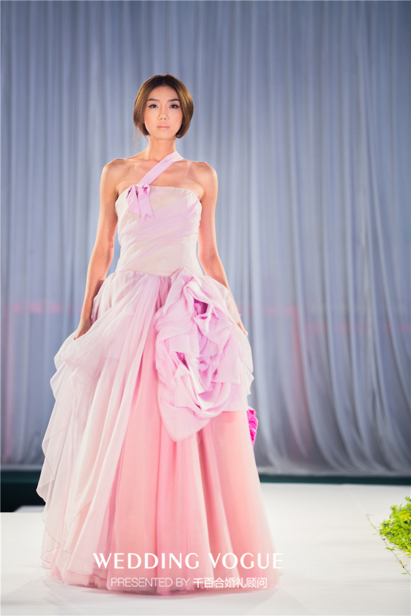现场宾客还未从“舞台剧”中缓过神来,优雅的模特已穿着轻盈的婚纱款款而来。穿过拱形原木花门和如梦如幻的帘雾,每位模特似从油画中走出的汉朝女子,他们妆容清淡,头发自然下垂或随意一扎,丝毫看不出雕琢的痕迹,与粉色、白色、甚至黑色的轻盈婚纱融为一体,跟随着此起彼伏的音乐,亦缓亦趋,步步生莲。本次婚礼秀中的婚纱,无论在材质、线条还是结构设计上都透出浓浓的美感。俞少军告诉婚礼风尚,婚纱的材质有着蝉翼般的轻盈,又不失厚重的下垂感和质感。同时,对色彩的运用非常大胆,他们是较早将黑色系或者灰色系婚纱带入国内的一个品牌。
