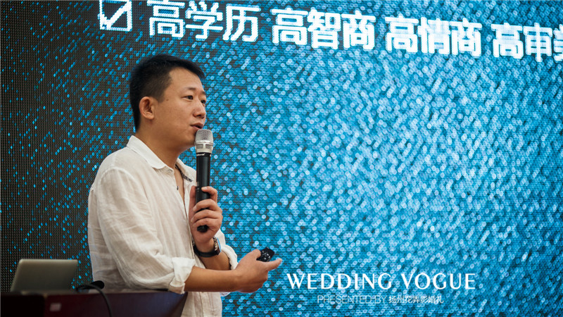 邵晨东老师以聊天的方式与大家探讨了《大婚时代》的主题,伴随着现场柔美缓和的音乐,邵老师娓娓道来。通过引经据典和自身的亲身经历,邵老师向大家讲述了大婚时代下的婚礼主持人所要坚守的精神内核。演讲结束后,在接受婚礼风尚的采访中,邵老师讲述了俄罗斯民族即便在饥饿和恐怖的年代,也要穿着礼服去欣赏歌剧。他认为这样的民族是值得尊敬的,他们的精神生活并不随着物质的增匮而消涨。引申到婚礼行业,邵老师希望我们也具备这种精神和追求。