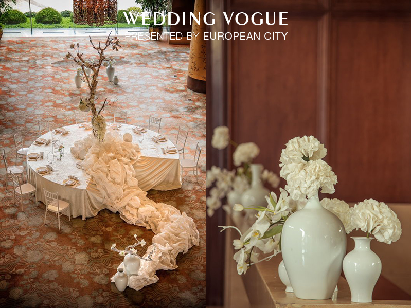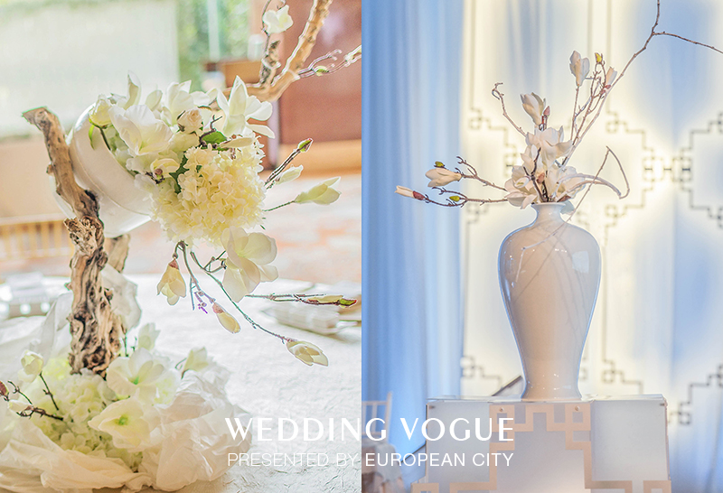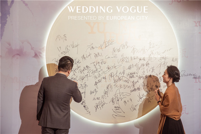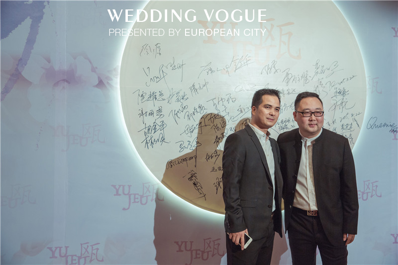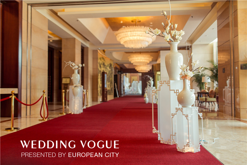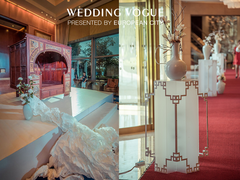 下午六点半,一场别开生面的红毯秀华丽上演。伴随着柔美的音乐,嘉宾们依次踏上红毯。婚礼风尚创始人陈刚、婚礼主义创始人娜娜、上海著名司仪归春艳等都来到了欧城礼仪十周年庆的现场。签到处一侧,陈列着一张古色古香、雕刻着温州民俗文化的的温州大床,沉稳的棕色与宁静的雪白相映成趣,将古典与现代时尚巧妙地结合起来。红毯两侧有序陈列着取源于温州窗户元素做成的十字形灯架,灯架顶部精心布置了古典韵味十足的花艺,整体看去,庄重、典雅又不失飘逸。