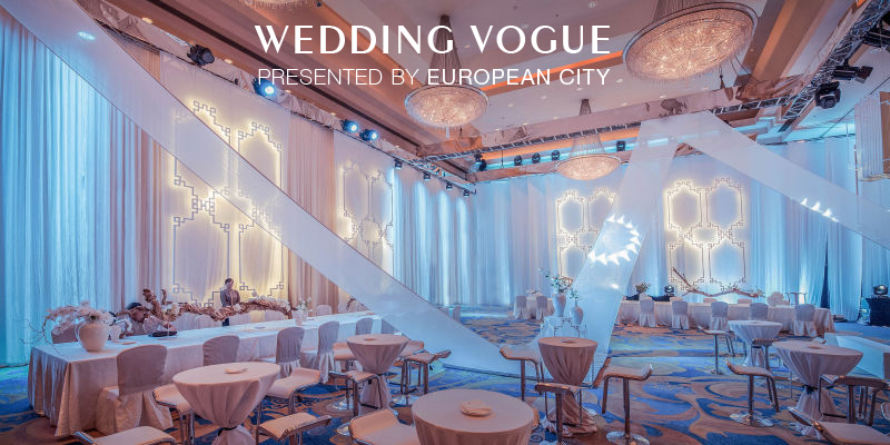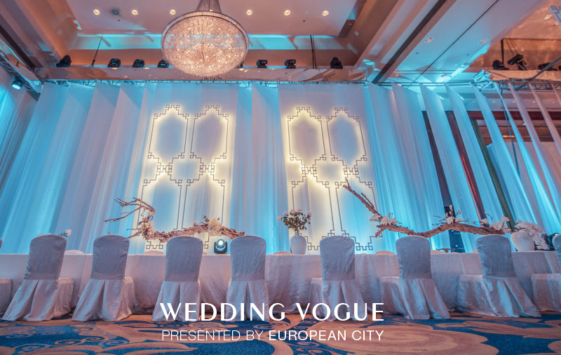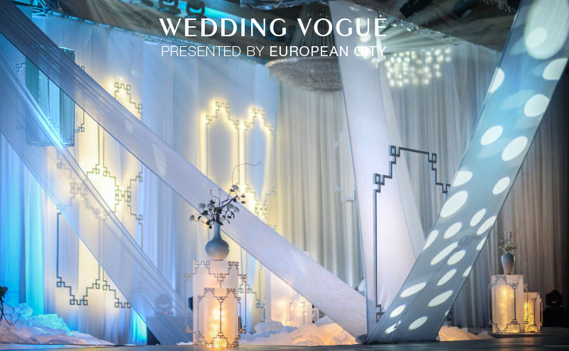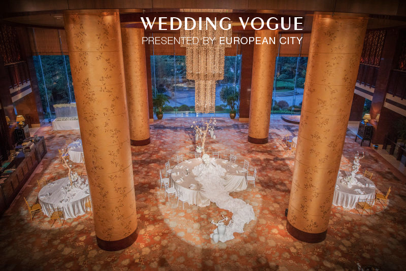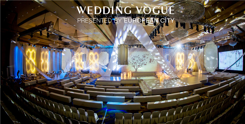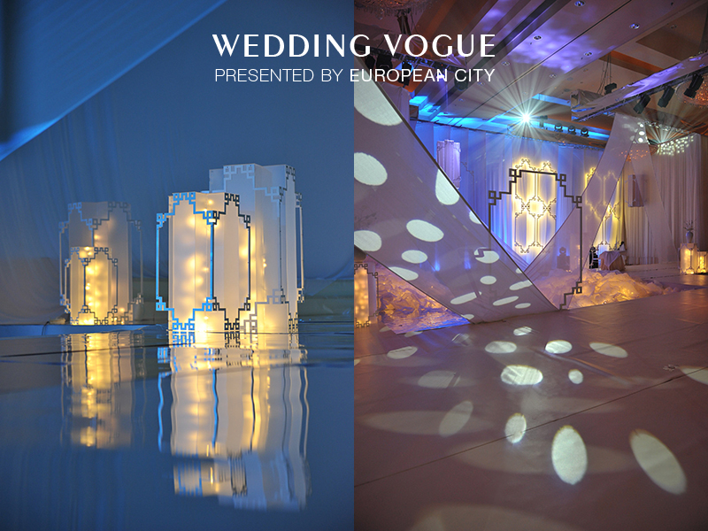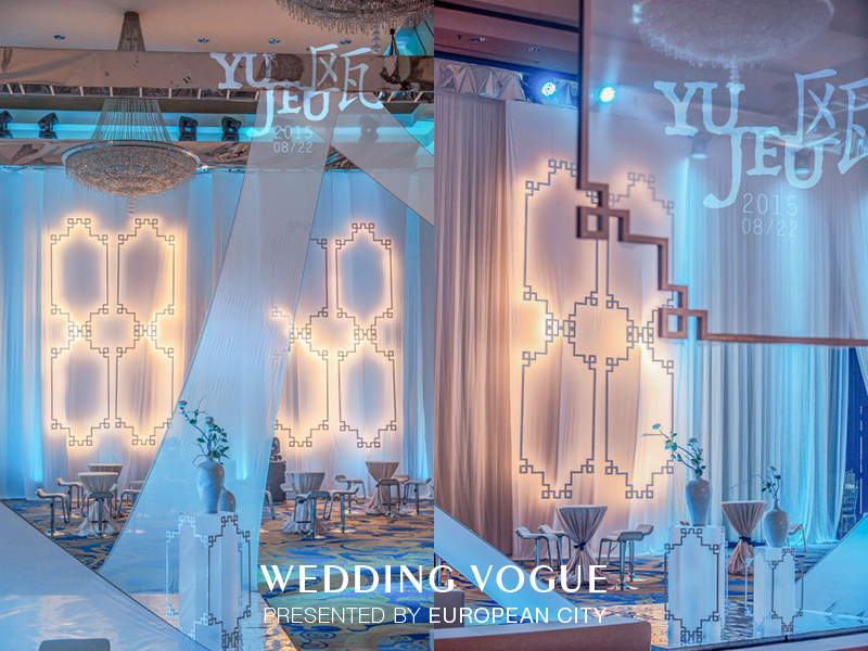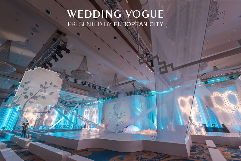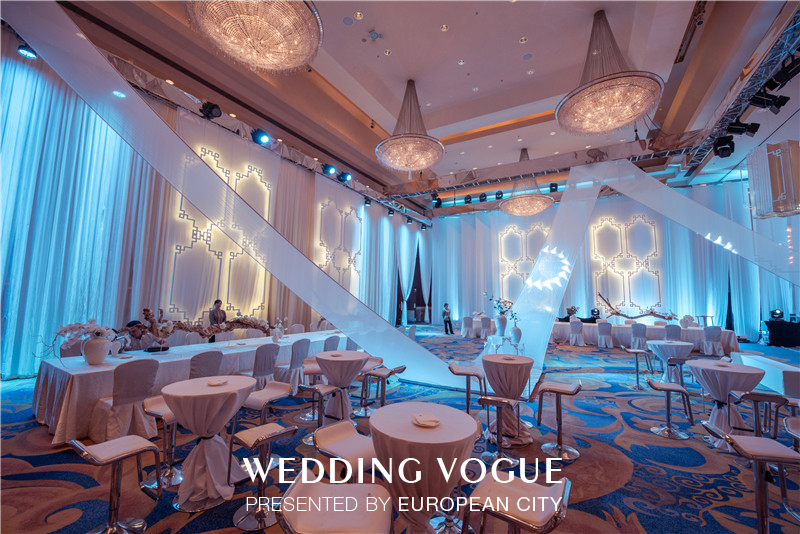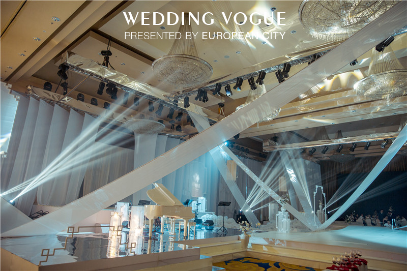 灵感设计来源于温州窗户的简约十字形框架,恰到好处地布置于雪白的墙幔之上,随着灯光颜色的变换,镜框呈现或简约、或清新、或隆重、或古典的美。空中雪白的布幔凌空而过,呈现不规律几何形状,将宴会大厅自然分割,层次鲜明。而赖教授空间设计的独特之处便在于,置身于如此简约大气的场景之内,感觉非常充盈饱满,丝毫不显空旷。
