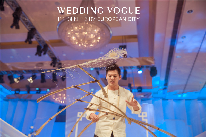 着中式传统嫁衣的新娘翩然而至,沉稳,内敛;披着欧式隆重婚纱的新娘轻盈而来,时尚,奢华。两位新娘相视一笑,擦肩而过。古典与时尚在这里交集、融合。赖教授本次婚嫁秀的设计理念便是古典文化与时尚元素的结合,作为婚纱秀的开场,这样的设计再次为宾客们带来了惊喜。