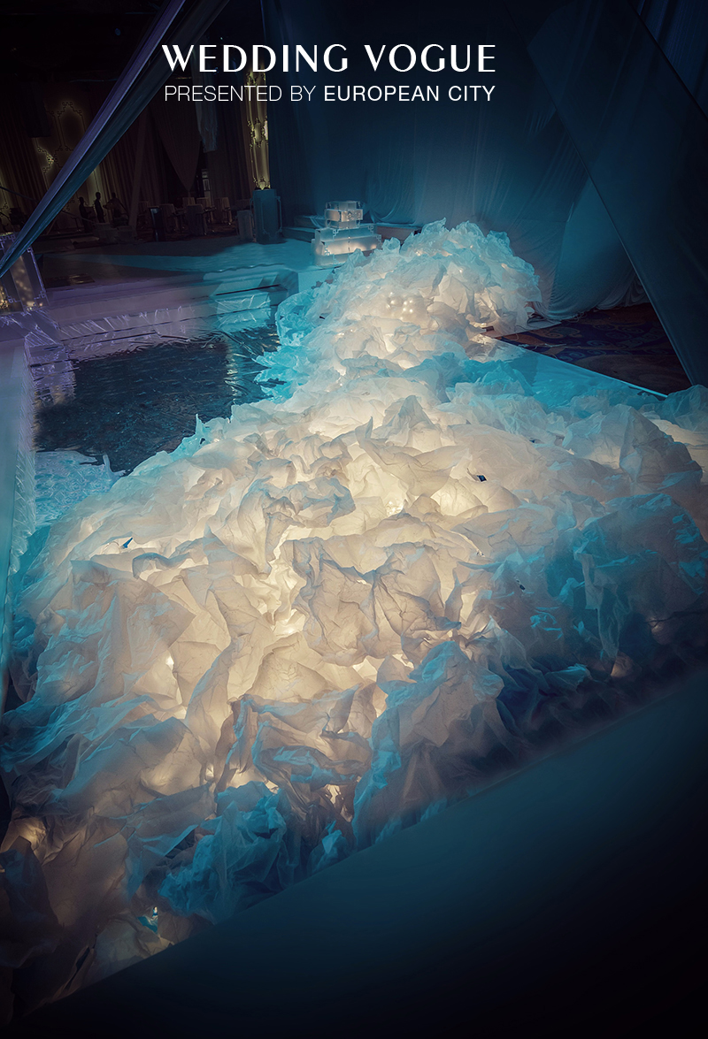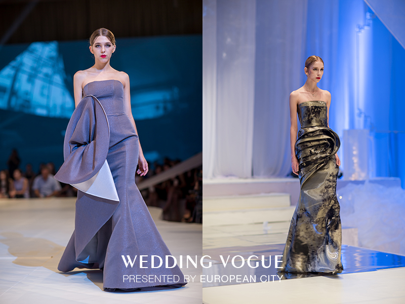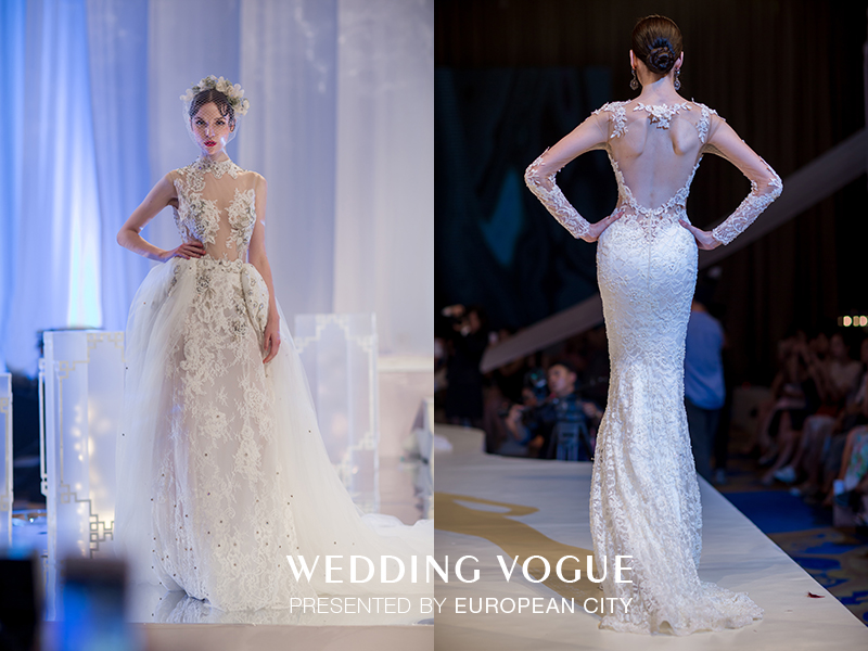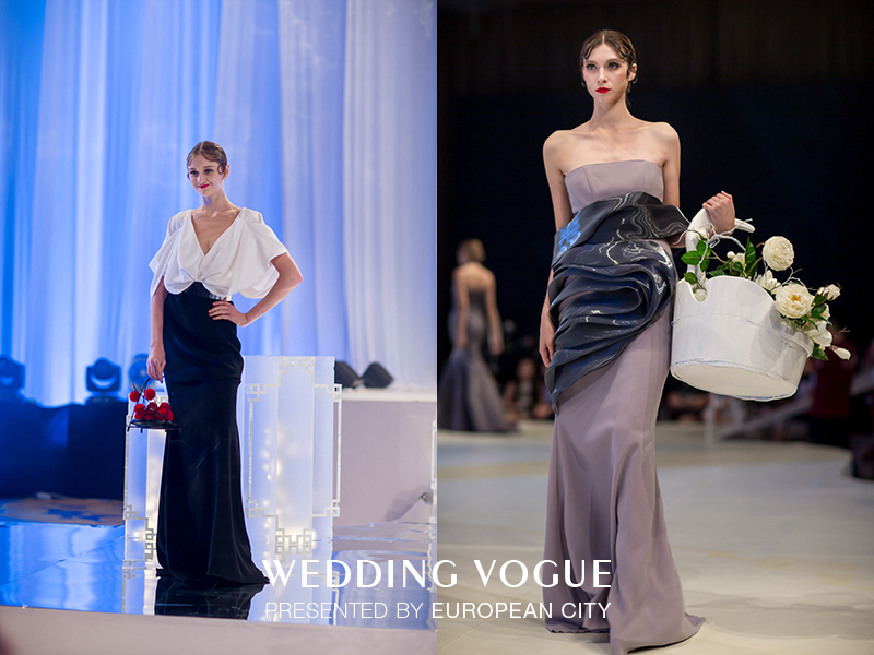 紧接着,黑色、灰色、白色的婚纱依次亮相。拖尾的仙气、鱼尾的优雅,婚纱于隆重的欧式质感中体现出郑重的东方仪式感,让现场宾客赞叹不已。