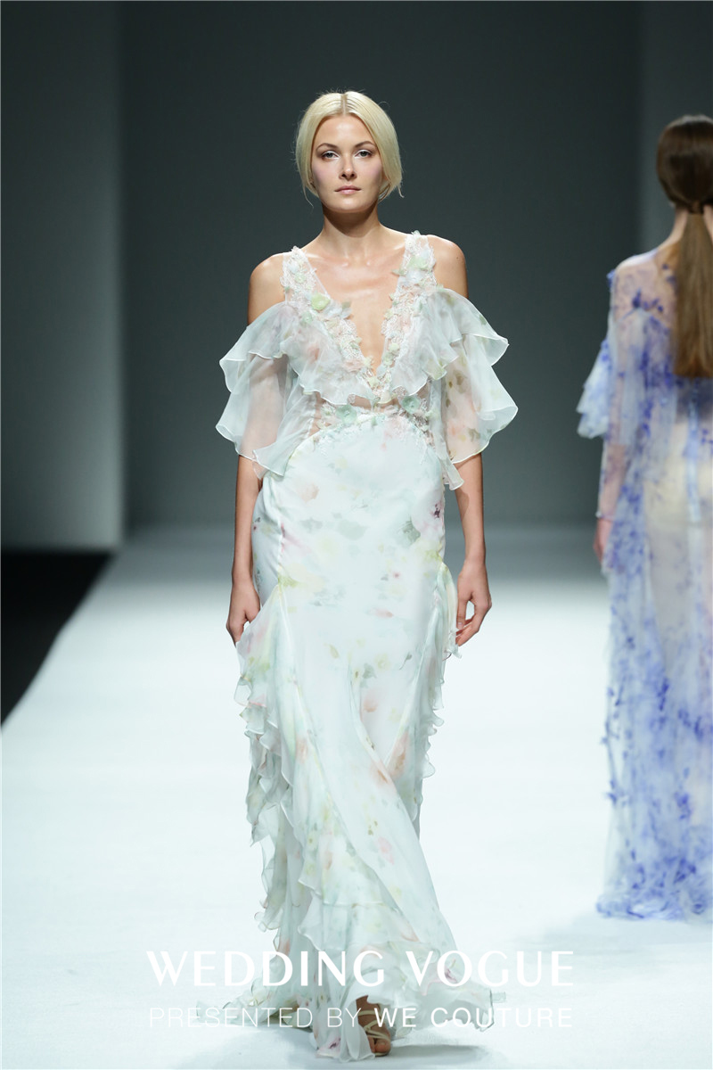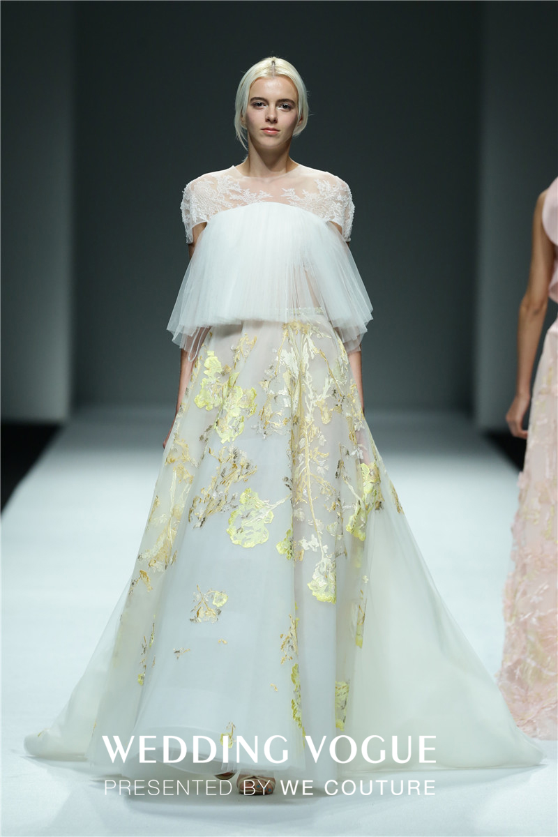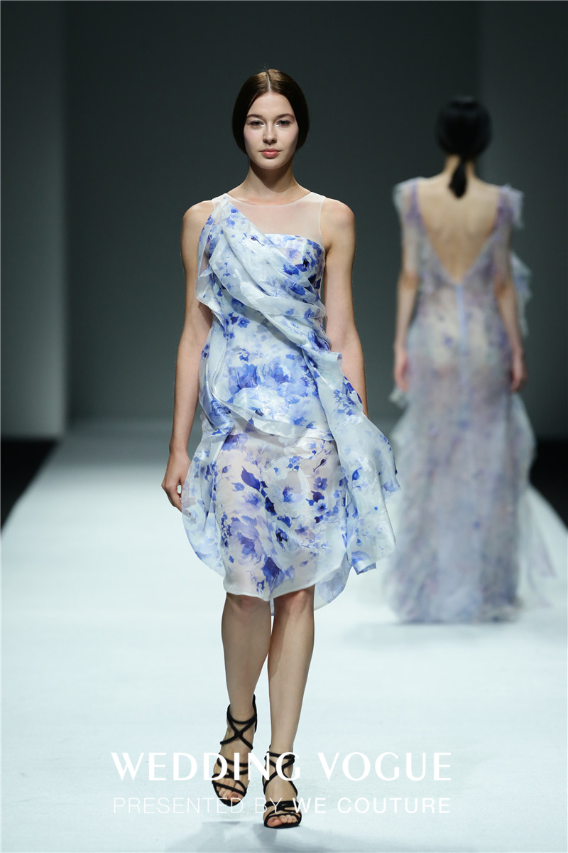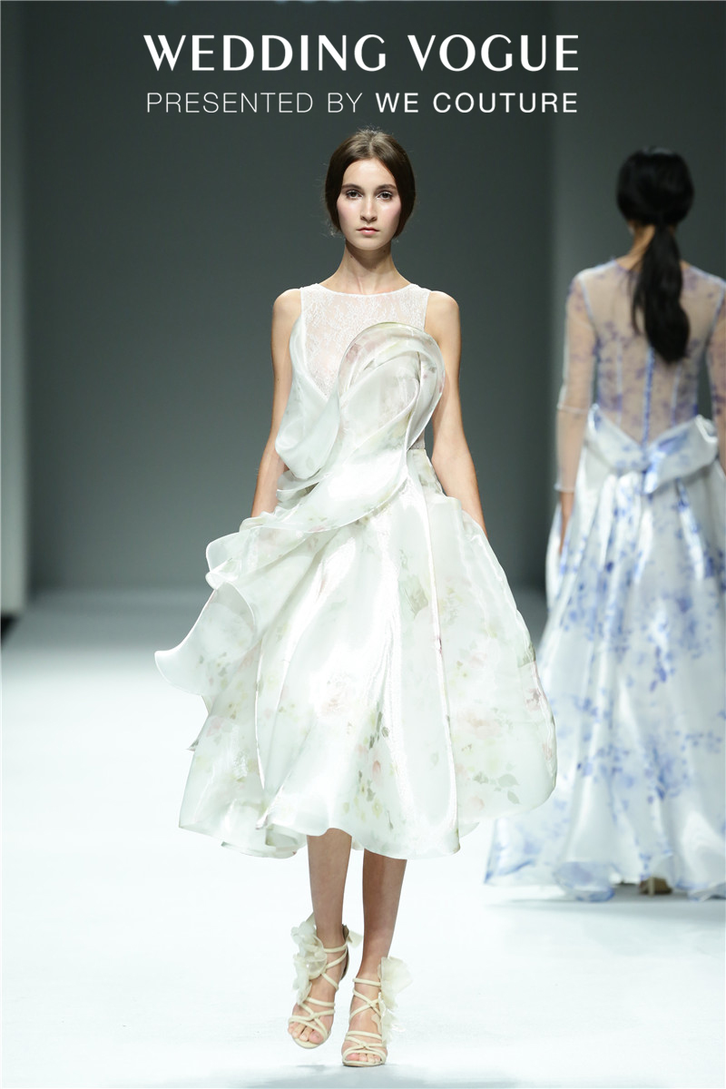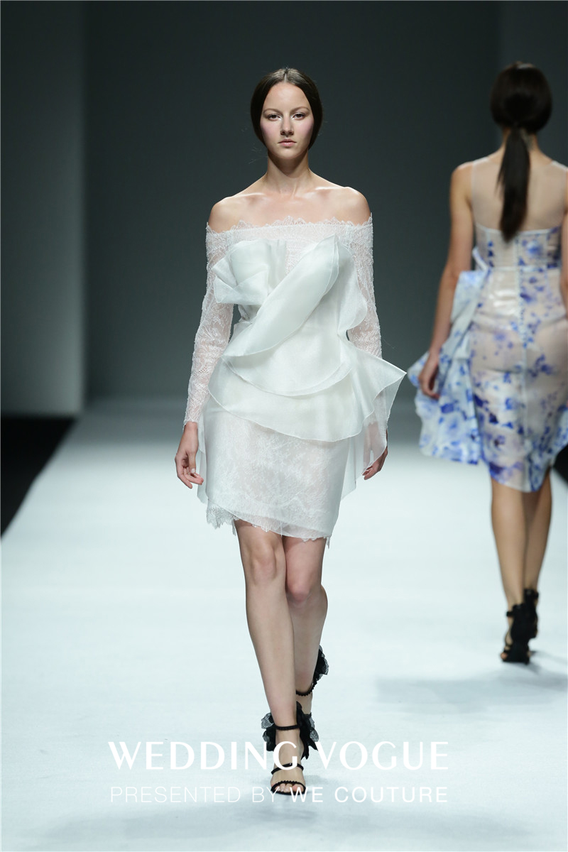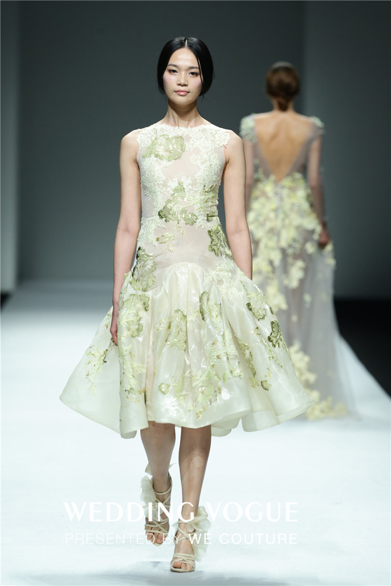 无论是及膝短款还是曳地拖尾,婚纱都本着流畅的剪裁和温和的色彩。设计上,设计师大部分选用半透明材质,纱质、蕾丝、丝质硬纱、丝绸等材质交替出现,短款婚纱凸显了女性的个性独立,中长款婚纱又透出女性的仙气、轻盈和线条的美感。