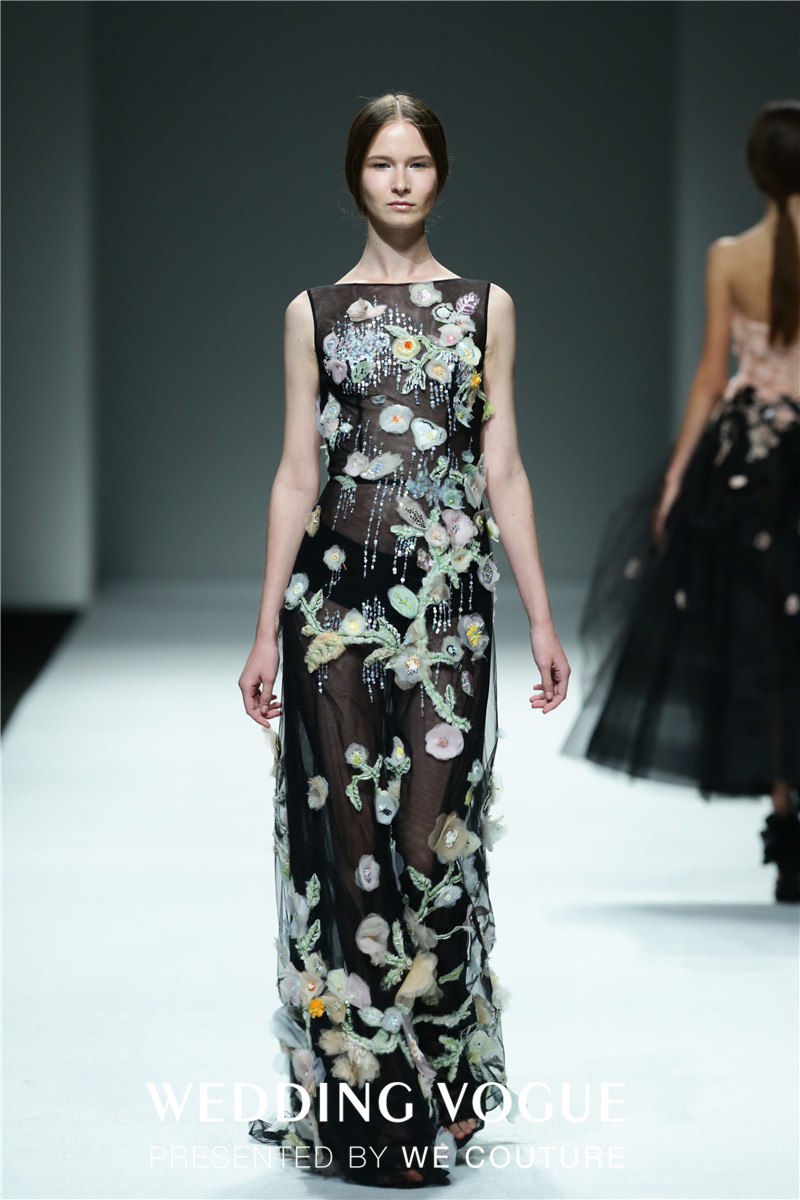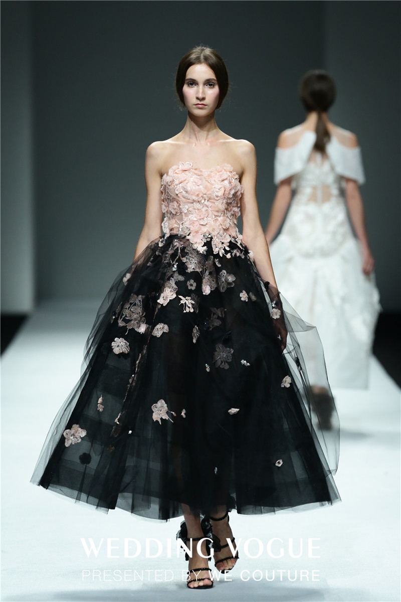 本次让大家眼前一亮的是黑色田园风格的婚纱。大胆的黑色婚纱,无论是蓬蓬的经典款,浪漫鱼尾款,还是简约包臀款,都点缀以淡蓝、淡绿、淡粉为主色调的花朵或蕾丝刺绣,一股清新田园风迎面而来,让人仿若置身大自然,而婚纱整体设计上的简约和线条又表达出对都市独立女性的赞美。