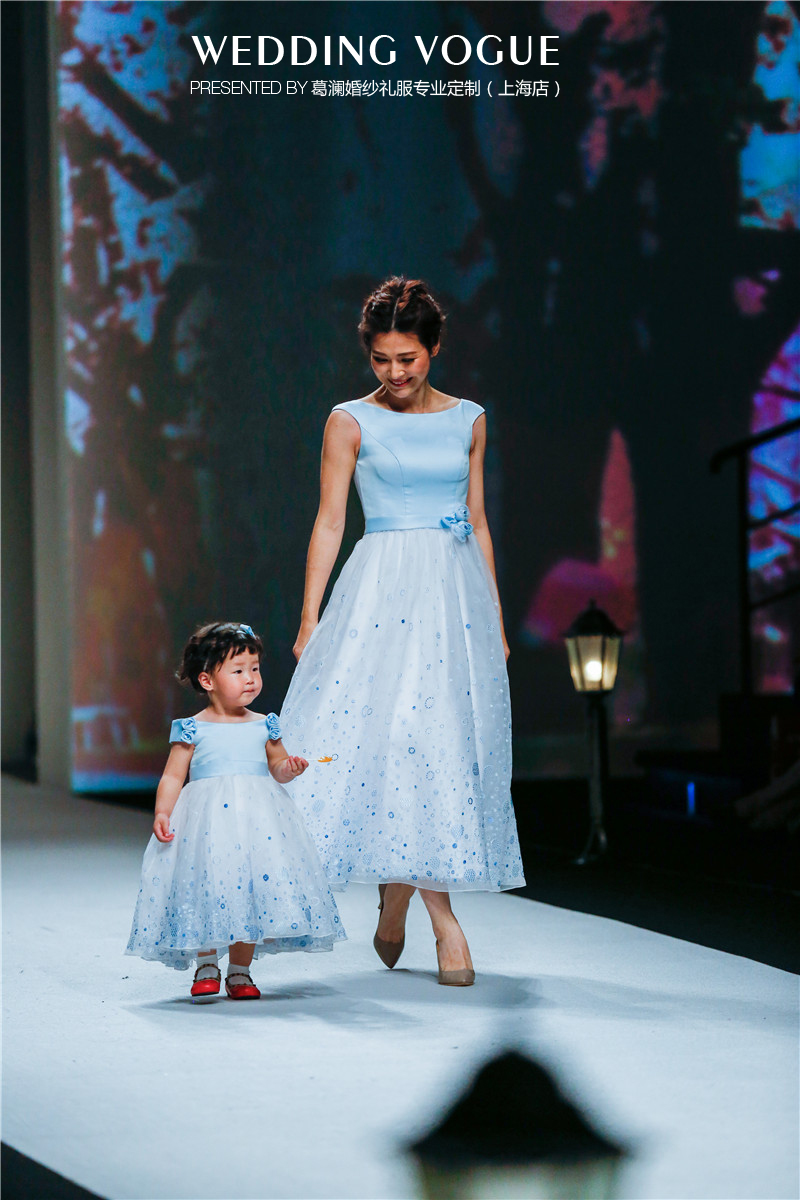 本次发布会的亮点之一,就是明星亲子秀。葛澜特邀影视明星童蕾携2岁女儿登台压轴,她们身着葛澜蓝白相间的新款婚纱亲子装亮相,清新、唯美,惊艳全场,这也是童蕾携女的“首秀”。