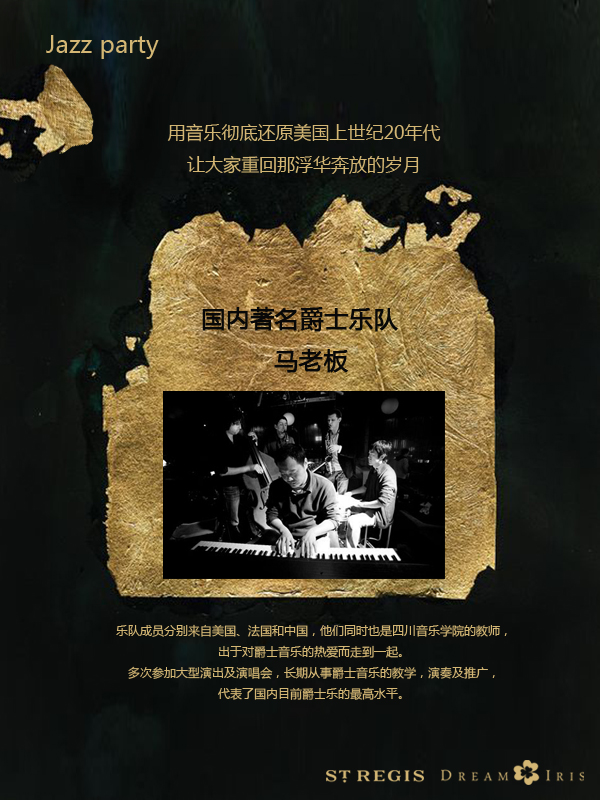 国内顶尖爵士乐队“马老板爵士乐队”为婚礼秀爵士PARTY暖场,用音乐彻底还原美国上世纪20年代,让大家重回那浮华奔放的岁月;开场大秀“最好的时光”音乐舞台剧,采用微电影+舞蹈的新型创意形式。著名音乐剧《金沙》 主角之一,“曾川玲”出演女主角,通过影片和现场演绎,让观众感受到前所未有的视觉盛宴!