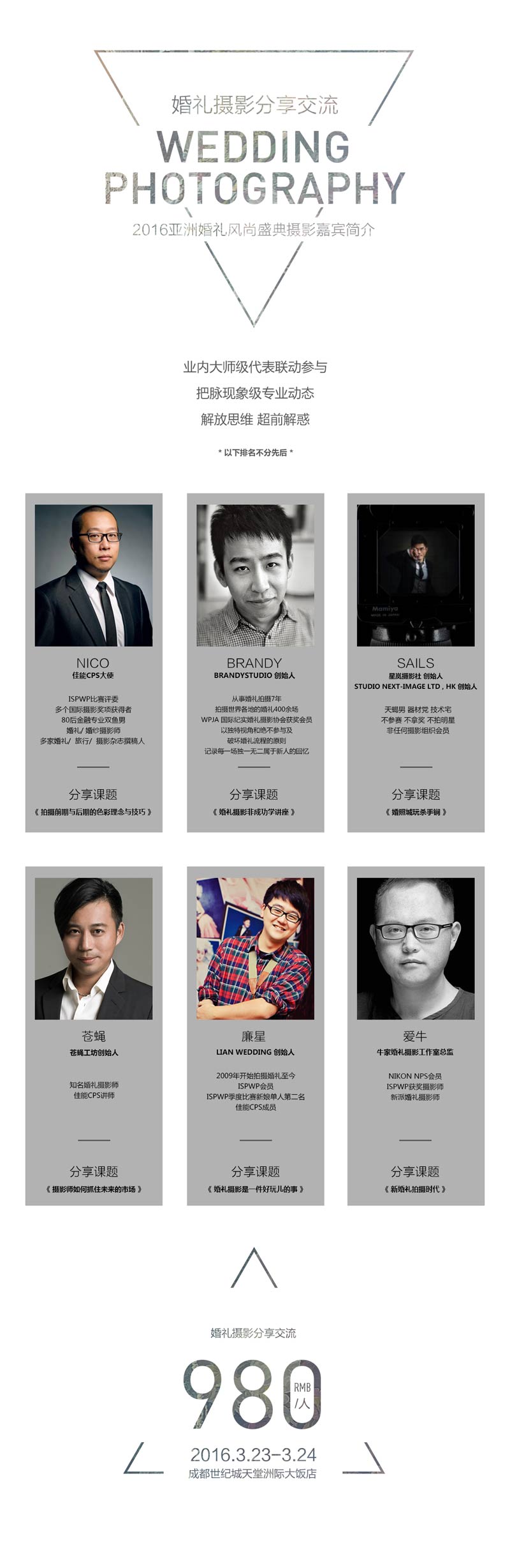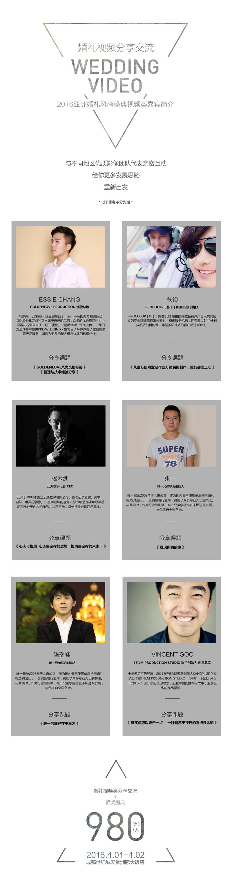 各地区的优质影像团队代表将欢聚蓉城,ESSIE CHANG、钱钧、杨云洲、张一、陈瑞峰和Vincent Goo六位婚礼摄像界的大咖将亲临现场与来宾进行亲密互动,就影像技术和制作经验的那些事儿与大家作一个直接的交流分享。每段精彩影像背后都有一份动人故事,且听业内优秀代表展现他们与众不同的独到眼光和记录美的超凡能力,诉说他们对职业的那份坚持与态度。