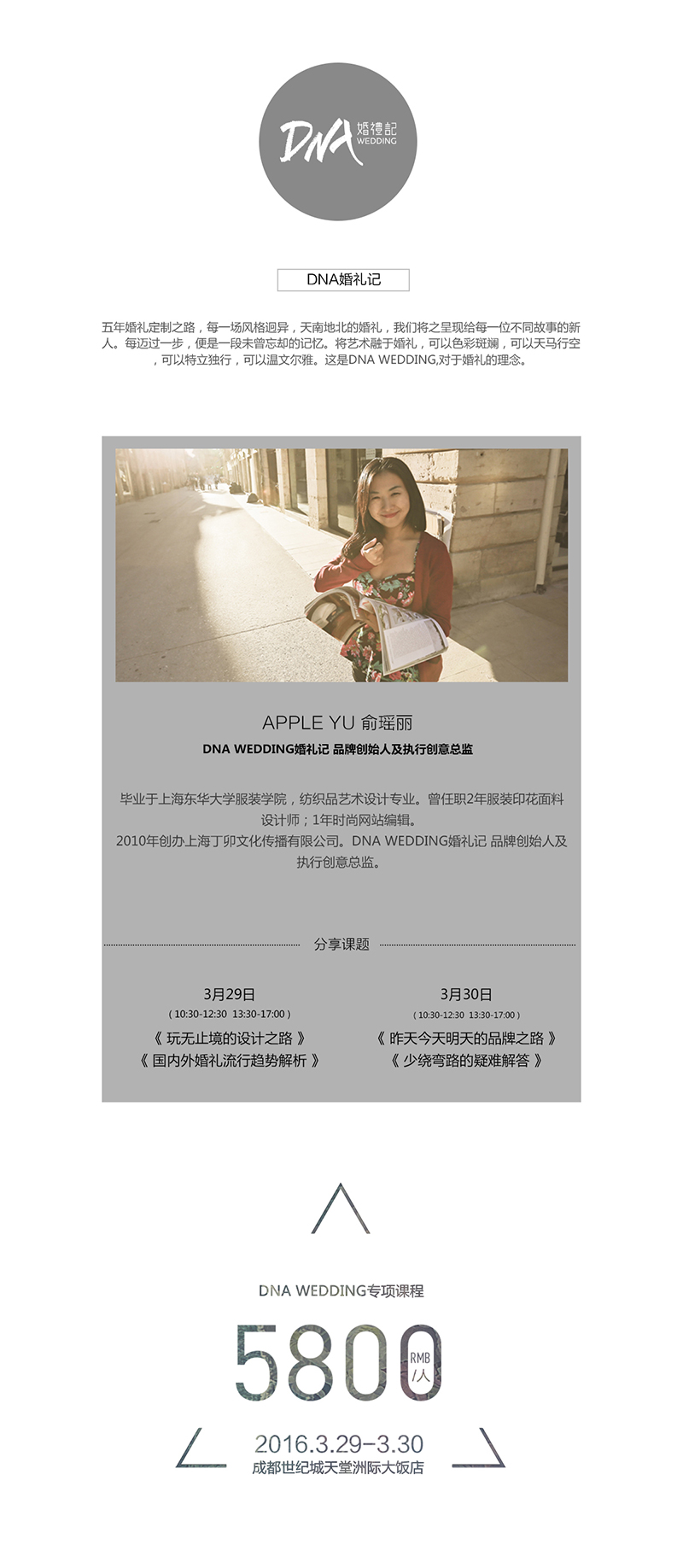 DNA宴会设计专项课程将由代表着行业高设计水平的DNAWedding的品牌创始人及执行创意总监Apple现场讲授《玩无止境的设计之路》,分析《国内外婚礼流行趋势解析》,介绍DNA自己的《昨天今天明天的品牌之路》并且有针对性的进行《少绕弯路的疑难解答》。婚礼背后的各种设计巧思与精妙创意将一一呈现。