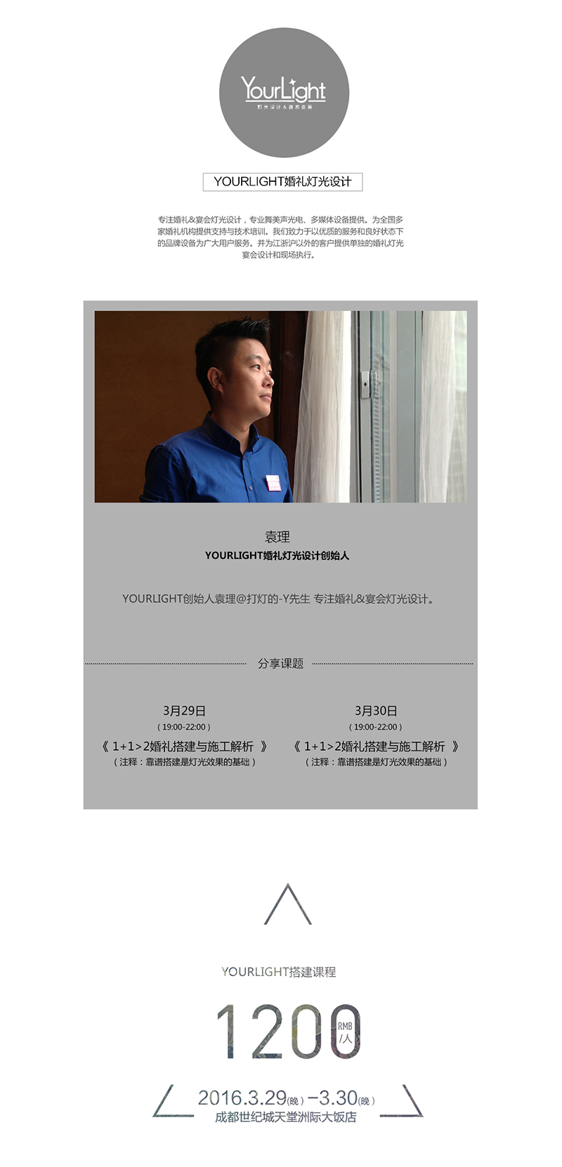 此外,YourLight搭建课程由YourLight婚礼灯光设计创始人袁理主讲,分享婚礼搭建中的技巧,以确保婚礼中的灯光效果完美呈现。婚礼灯光不仅对于设计的现场效果有着不可忽视的作用,也对后期影像呈现有影响。在婚礼灯光方面已经有12年经验的Y先生袁理将告诉你《1+1>2婚礼搭建与施工解析》。