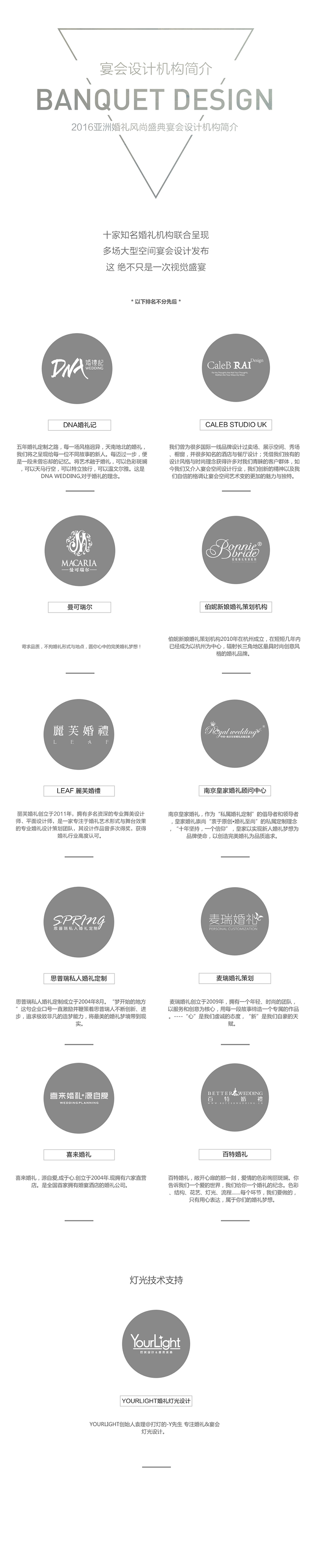 10场大型空间宴会设计发布由国内10家知名婚礼机构DNAWedding婚礼机、CaleB RAI、曼可瑞尔、伯妮新娘、丽芙婚礼、南京皇家婚礼顾问中心、思普瑞私人婚礼定制、麦瑞婚礼策划、喜来婚礼和百特婚礼全程参与。这些机构将带来最前沿先锋的婚礼设计理念及元素,多元设计的运用,前卫创意的融入,定能为婚礼人和前来参观的准新人带去更多的专业婚礼灵感。