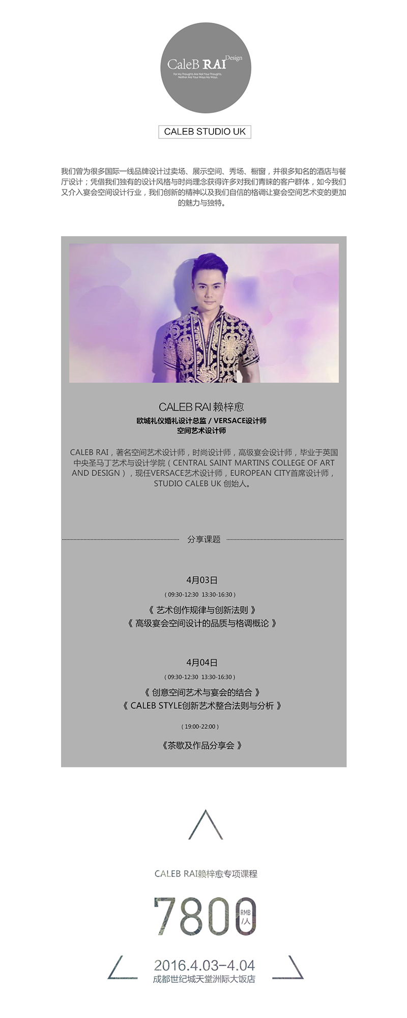 4月3日-4日,是 Caleb RAI赖梓愈宴会设计专项课程分享。Caleb RAI毕业于英国中央圣马丁艺术与设计学院,是优秀的婚礼人,更是VERSACE艺术设计师,空间设计师。他的作品与普通的婚礼设计不同,融入了更多的多元化艺术元素,此次将就《艺术创作规律与创新法则》《高级宴会空间设计的品质与格调概论》《创意空间艺术与宴会的结合》《CALEB STYLE创新艺术整合法则与分析》四个主题与我们分享他如何将空间艺术融入设计,如何将创新艺术整合。