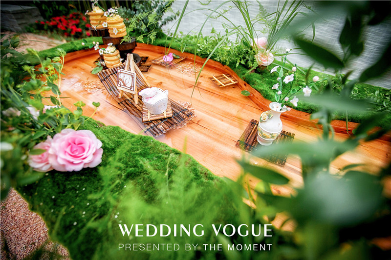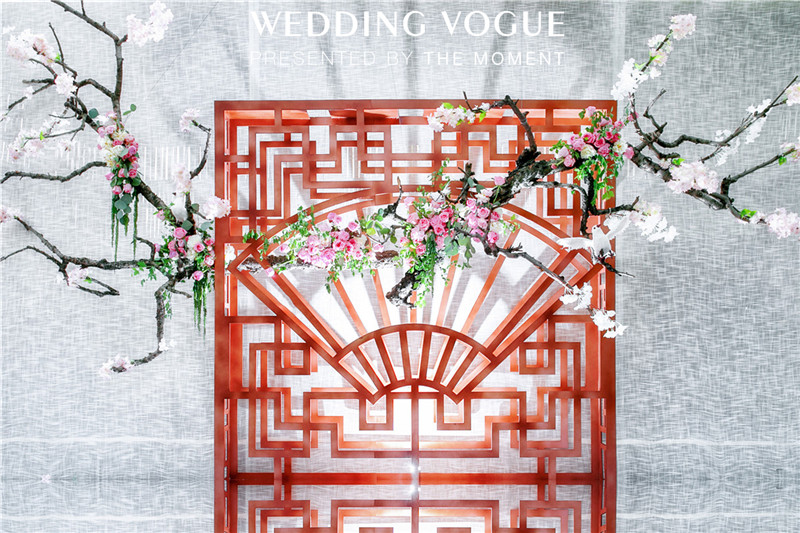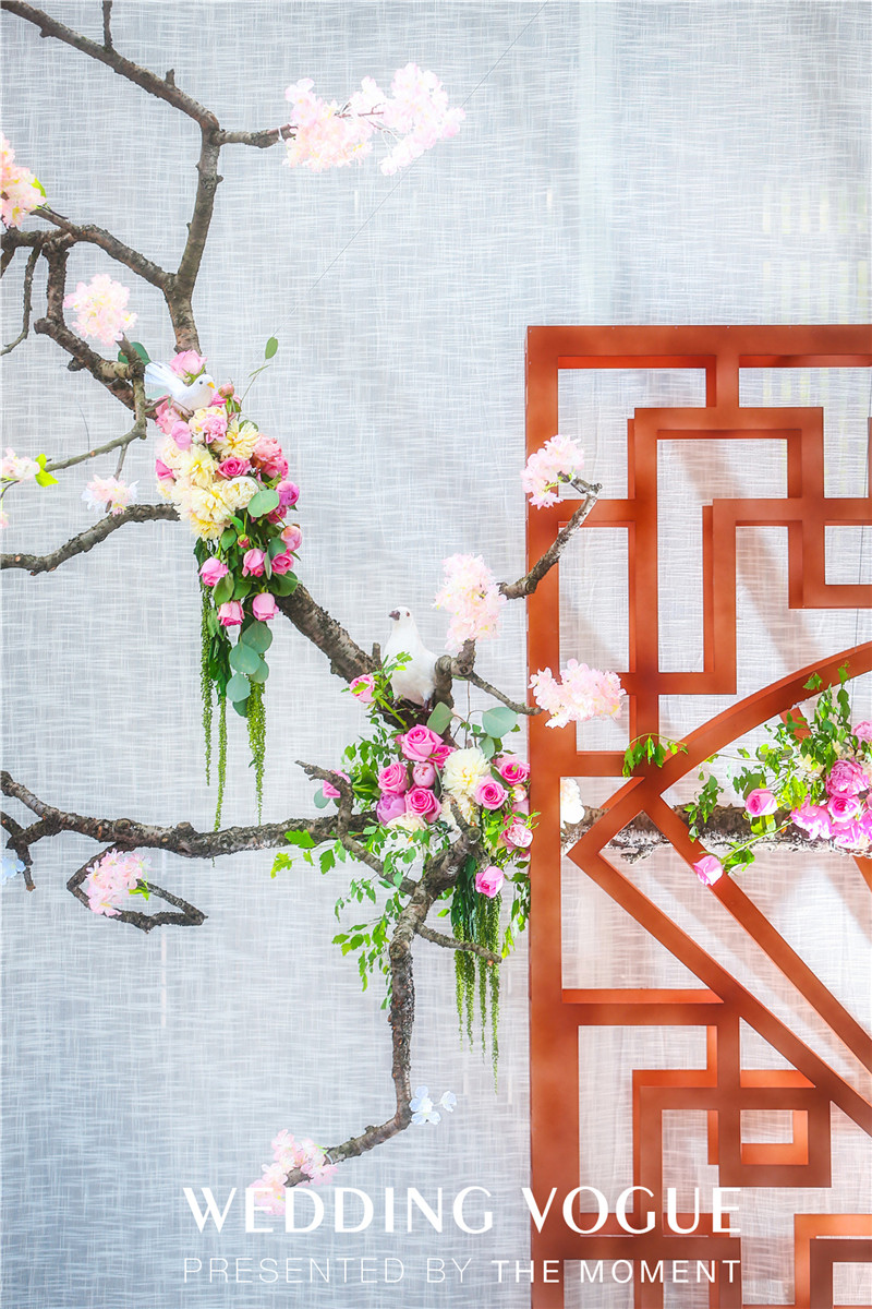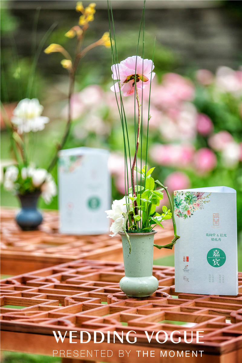 “谷雨三朝看牡丹,四月带花移芍药。”初入会场,合影墙上的芍药便跃然入眼。这种属于春天的花开得浓烈,在婚礼中并不常见,却在这里被广泛运用,甚至躲在了翻糖蛋糕上,安在了宾客桌椅上。被植被包围的水上甜品桌与西溪湿地的地缘地貌呼应,变成一个微缩景观,颇为精巧。而江南园林特有的窗格则变成了完美的背景板,芍药樱花攀附于上,是“一只红杏出墙来”的春光满溢。从用木片制成的签到板,到用镂空窗格演化而来的桌椅,每一处的细节都体现着拾光婚礼的用心与细致。这一份心思,又正好与花间堂内摇曳的鸢尾,铺着细细石子的小路相得益彰。
