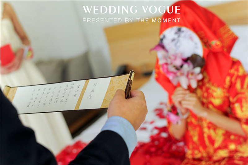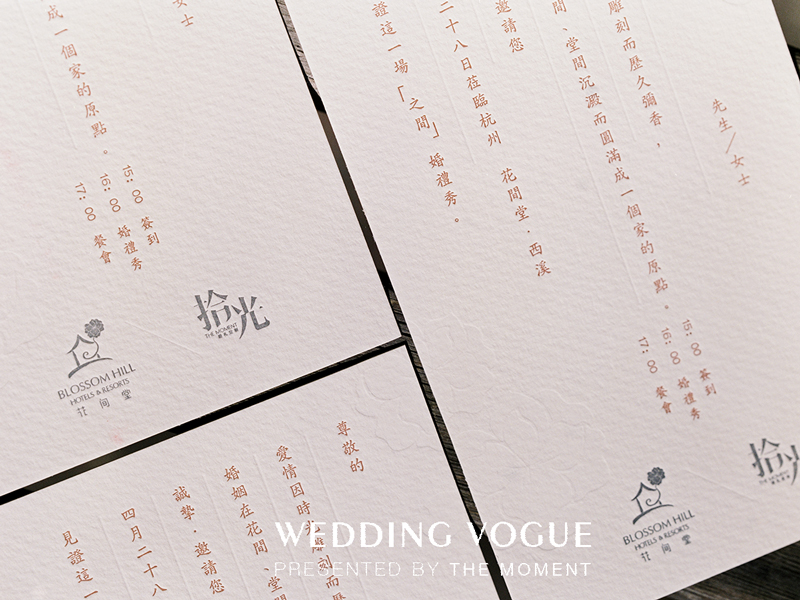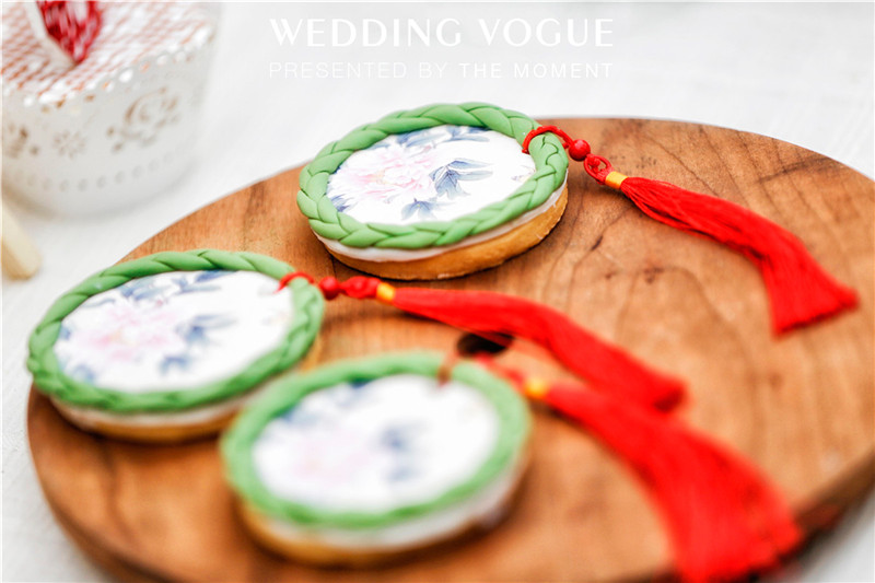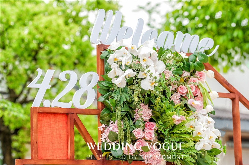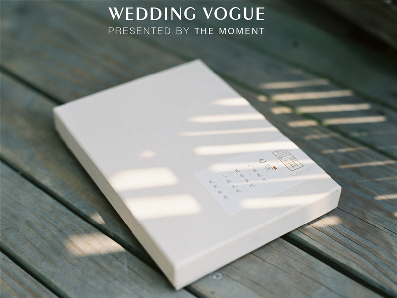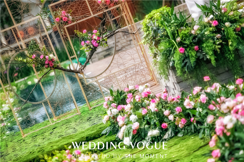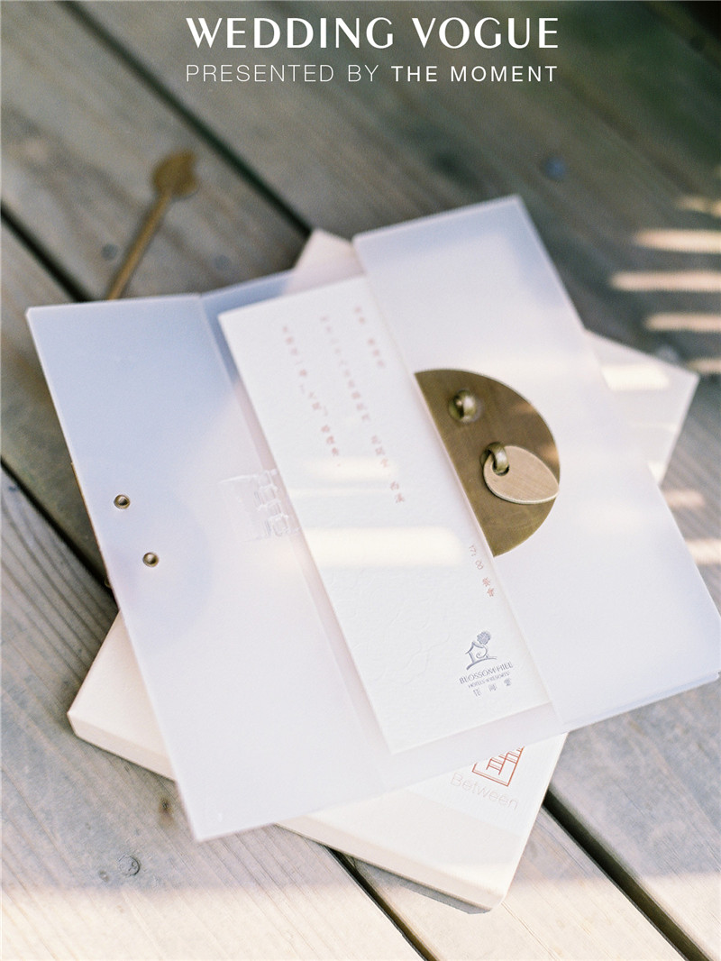 “谷雨三朝看牡丹,四月带花移芍药。”初入会场,合影墙上的芍药便跃然入眼。这种属于春天的花开得浓烈,在婚礼中并不常见,却在这里被广泛运用,甚至躲在了翻糖蛋糕上,安在了宾客桌椅上。被植被包围的水上甜品桌与西溪湿地的地缘地貌呼应,变成一个微缩景观,颇为精巧。而江南园林特有的窗格则变成了完美的背景板,芍药樱花攀附于上,是“一只红杏出墙来”的春光满溢。从用木片制成的签到板,到用镂空窗格演化而来的桌椅,每一处的细节都体现着拾光婚礼的用心与细致。这一份心思,又正好与花间堂内摇曳的鸢尾,铺着细细石子的小路相得益彰。
