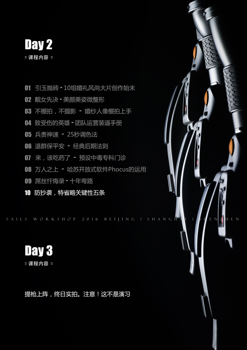 火热八月,婚礼风尚将再度联合哈苏相机官方签约婚礼摄影师,星岚摄影社创始人,婚礼风尚最多大片合作摄影师Sails,于深圳,上海,北京三地分别开设Workshop课程。和去年一样,这位备受同行喜爱与尊重的摄影大师将再一次为你带来不繁诉虚物,直接收获干货的纯技术分享课程。