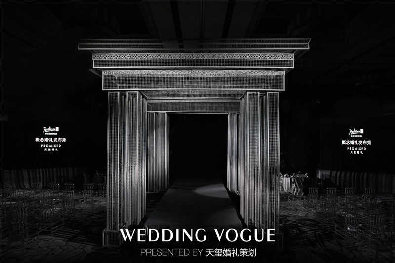 此次婚礼秀的舞台运用了网格门柱,利用网格的特性,在似白非白的状态下呈现出5米高的壮丽门柱,来象征人生中跨越的层层里程。又透过另一种意义上的灰来探视主舞台的灰度变化。从实际意义上来讲,也让模特在有装饰物也不遮挡的情况下有了更大的演绎空间。