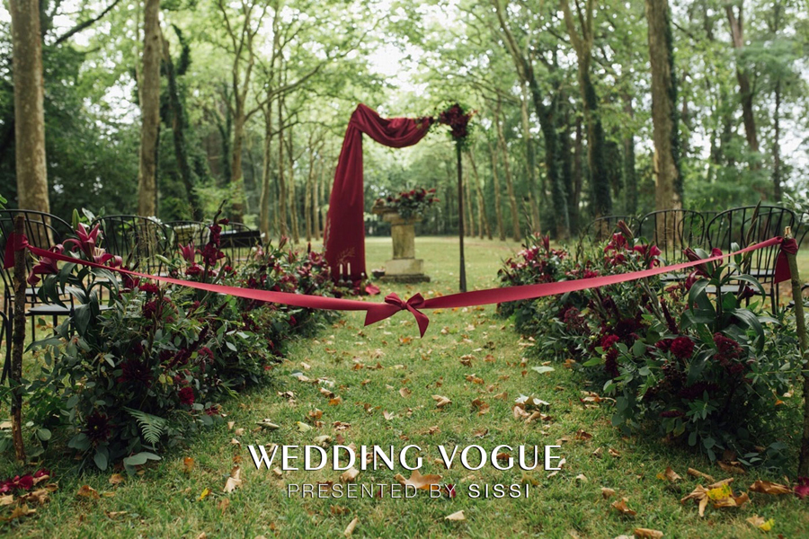 而这场以酒红为主色调的盖茨比复古风格婚礼,仪式区以丝绒装饰,与婚纱蕾丝相得益彰;所有花材都与主题同色,温和有韵味。而场地所带给婚礼的,自然是纯天然的浪漫情愫。