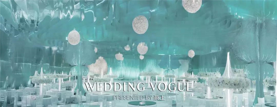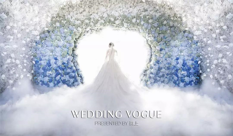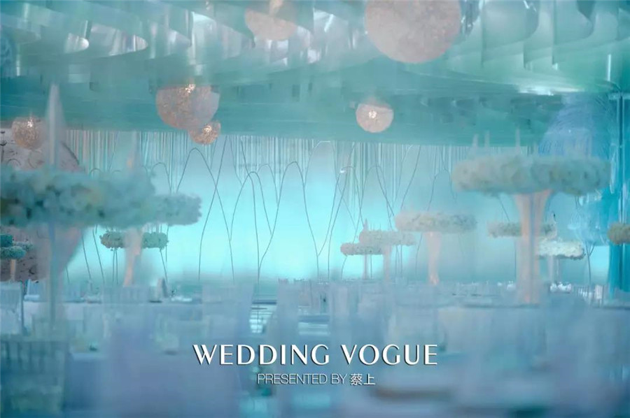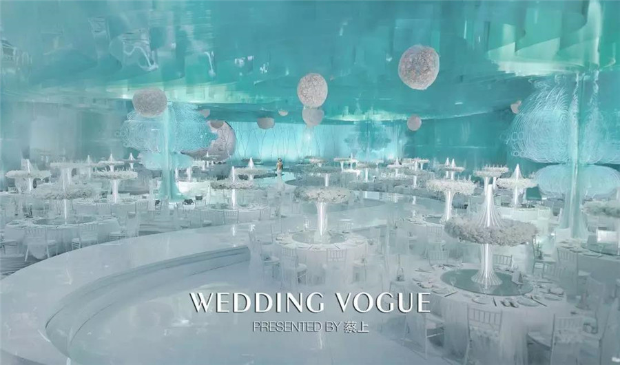 婚礼其日,宾客走过60米长的通道步入现场,彩色云雾环绕左右,一千朵真丝花绽放其间,从青玉到幽蓝,如天宫画师打翻了色盘,着墨人间。
