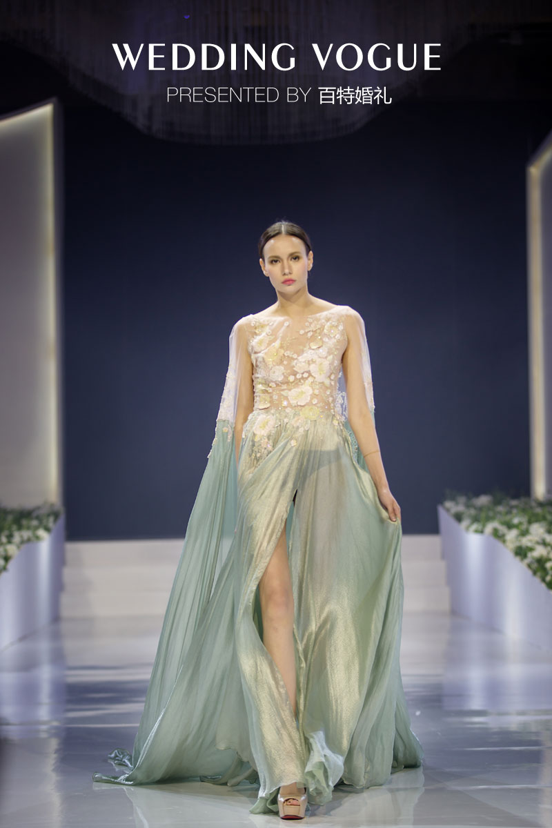 此次婚礼秀的一大亮点,便是由MANLI BRIDE高级定制联手化妆师刘超倾力呈现的《秘流》系列新品首秀。服装融合了东方的诗意色彩与西方的抽象朦胧,加入了浓郁奢华的大面积花朵和纯手工面料的精致通透。除去繁复的矫饰,简洁明快的妆容与模特轻盈的步伐,将轻薄的婚纱演绎得仙气飘飘。