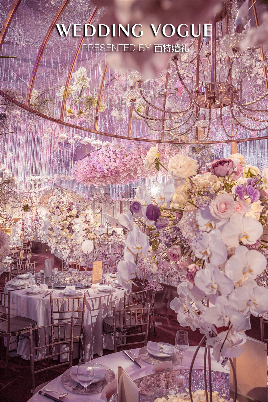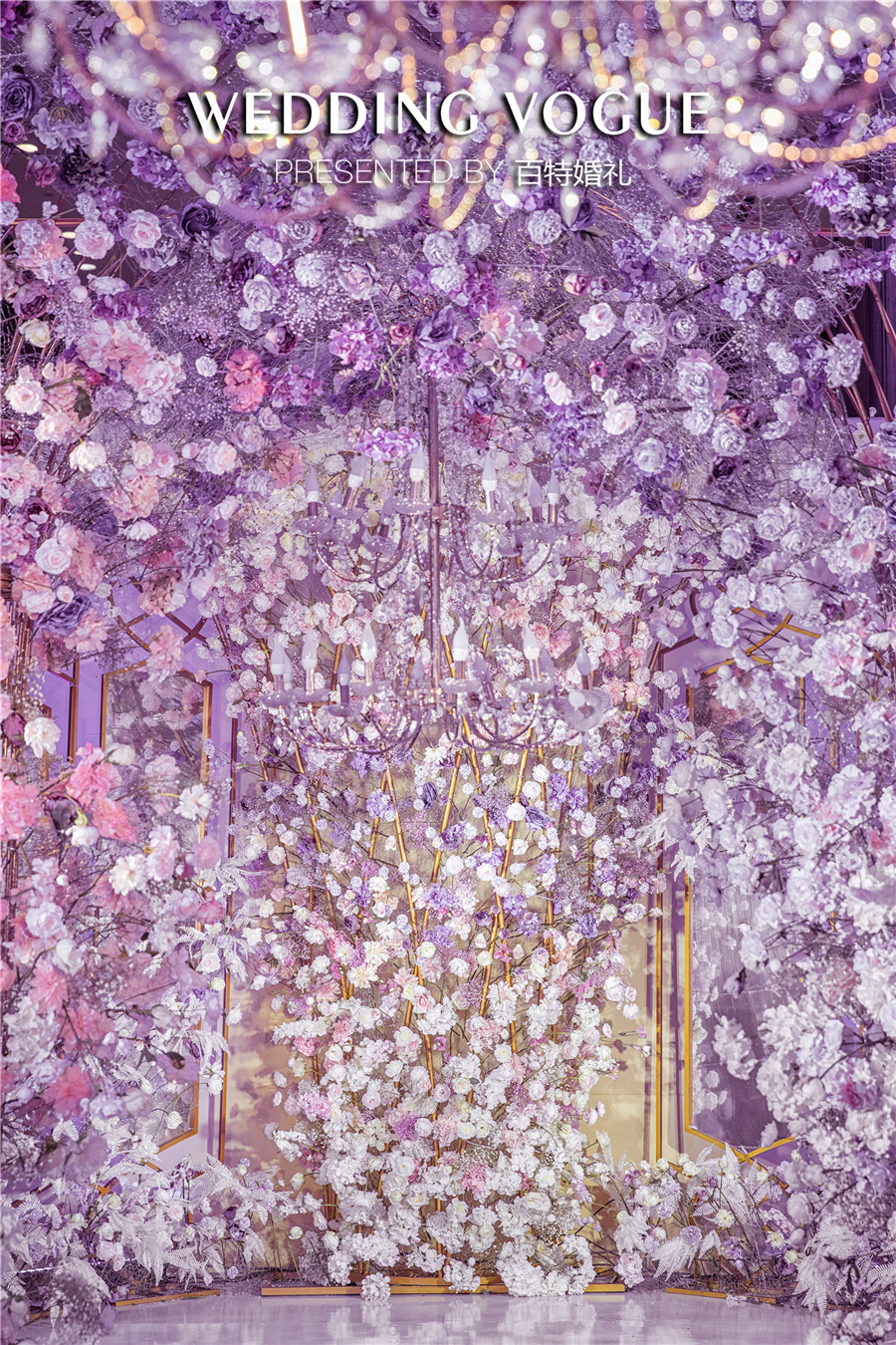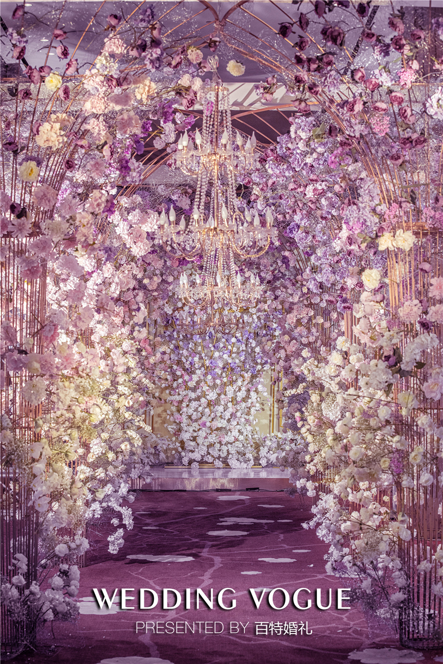 这场婚礼在色系上选择了少女专属色粉色搭配神秘浪漫的紫色,色彩层次分明,更加突出了少女的气息。在花材上使用了大量的淡色系的花朵,用了大量的花朵打造了一座精致又梦幻的秘密花园。