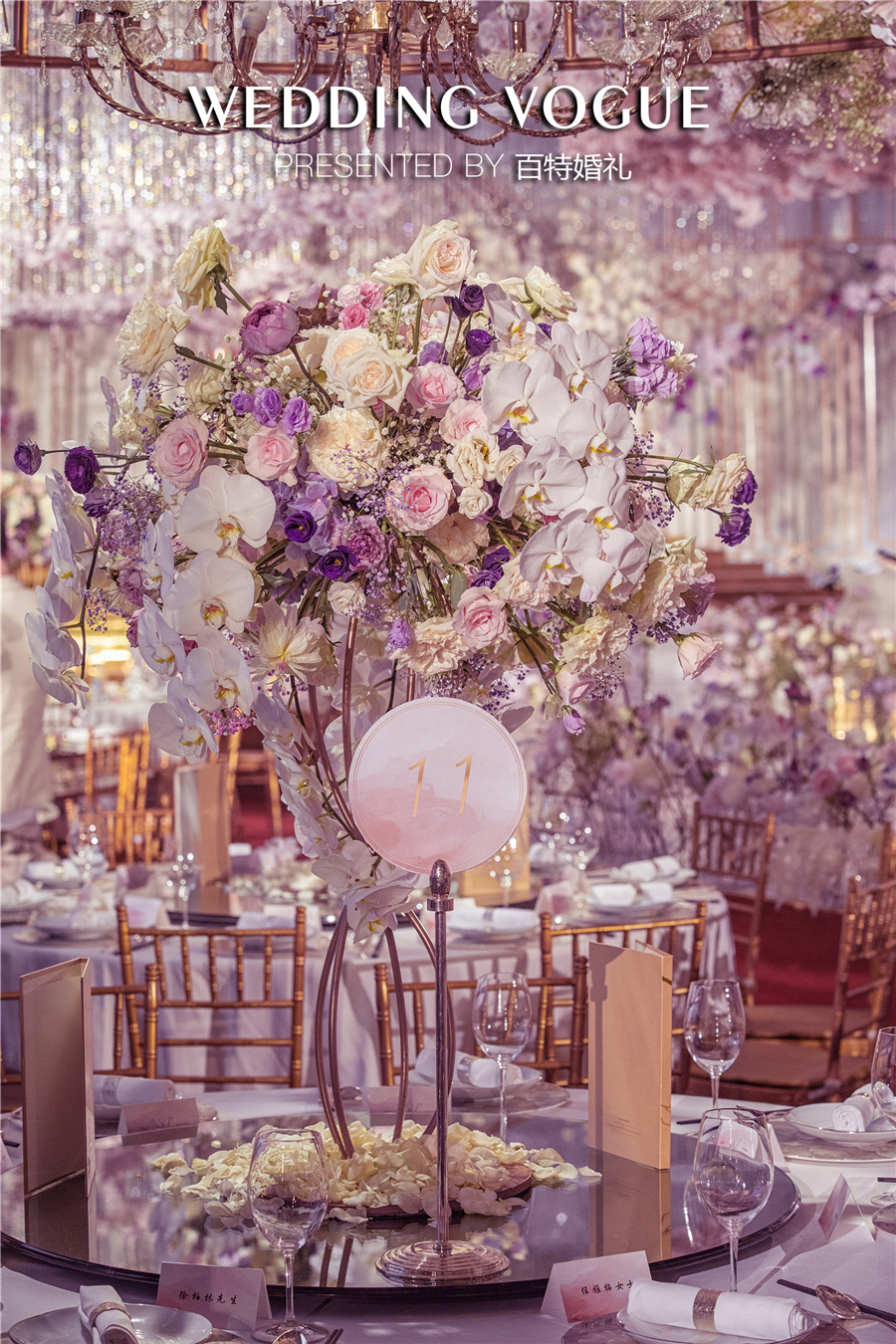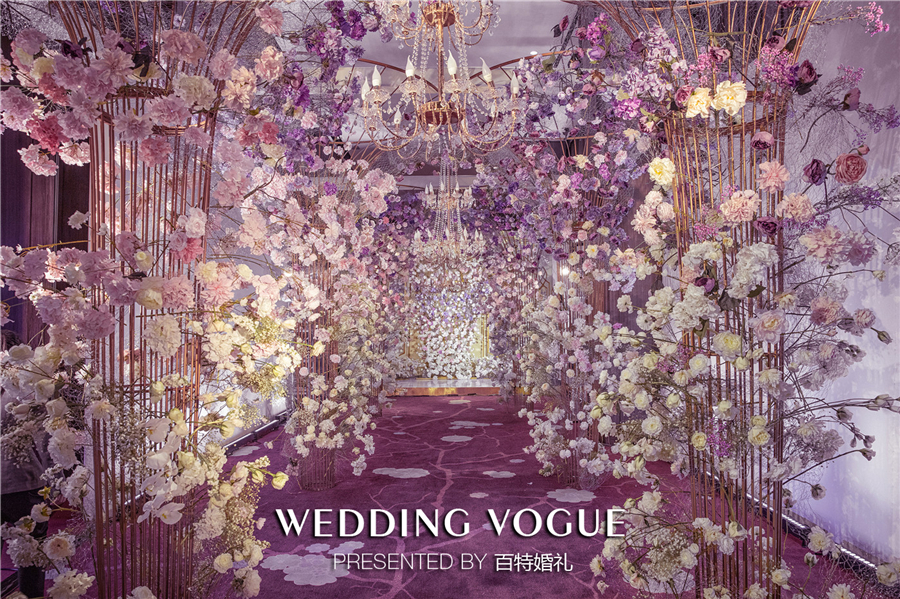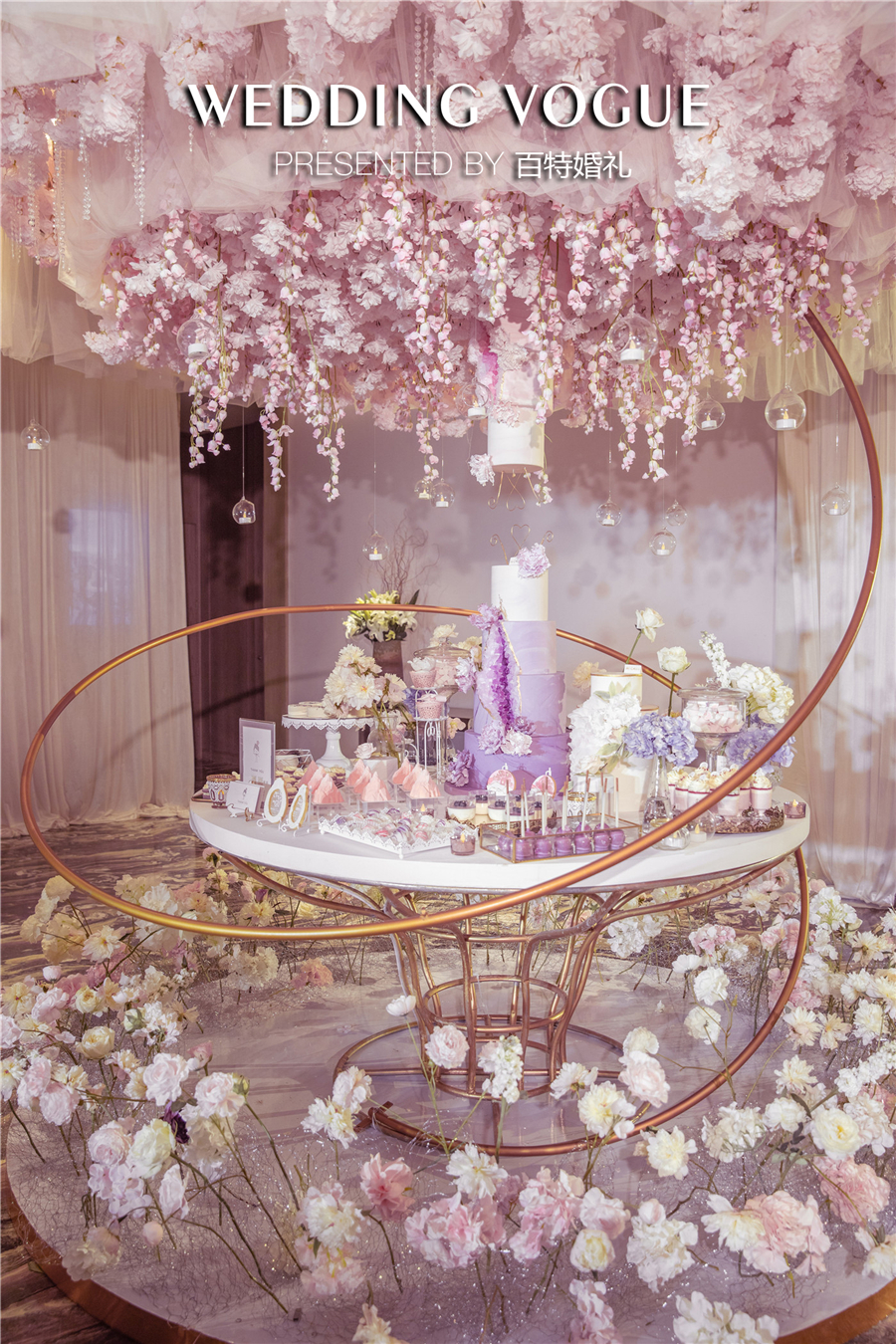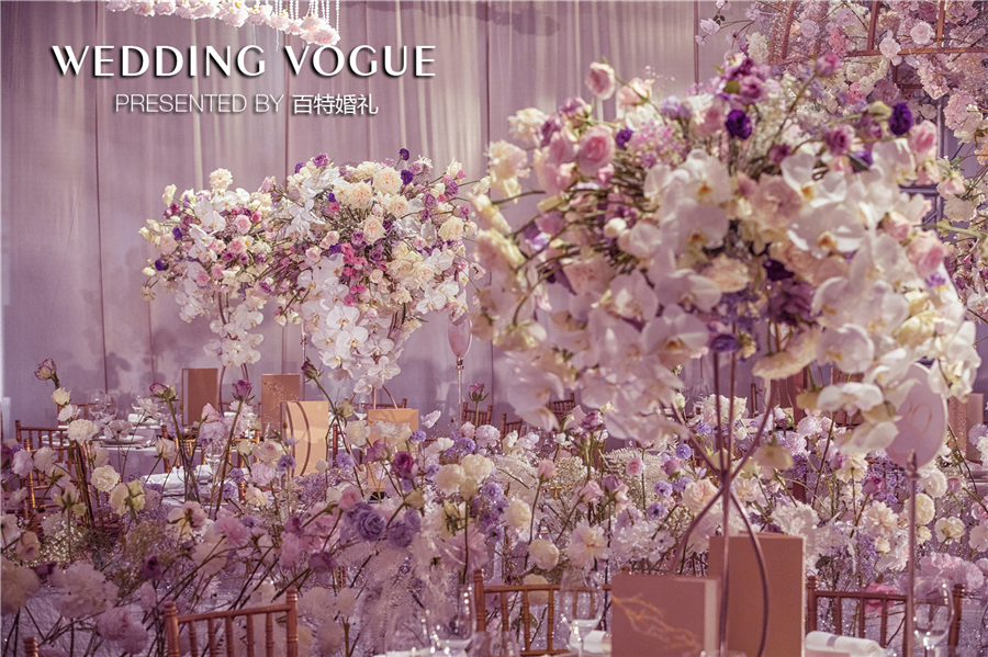 这场婚礼在色系上选择了少女专属色粉色搭配神秘浪漫的紫色,色彩层次分明,更加突出了少女的气息。在花材上使用了大量的淡色系的花朵,用了大量的花朵打造了一座精致又梦幻的秘密花园。