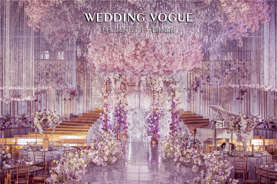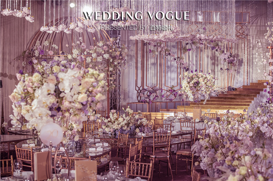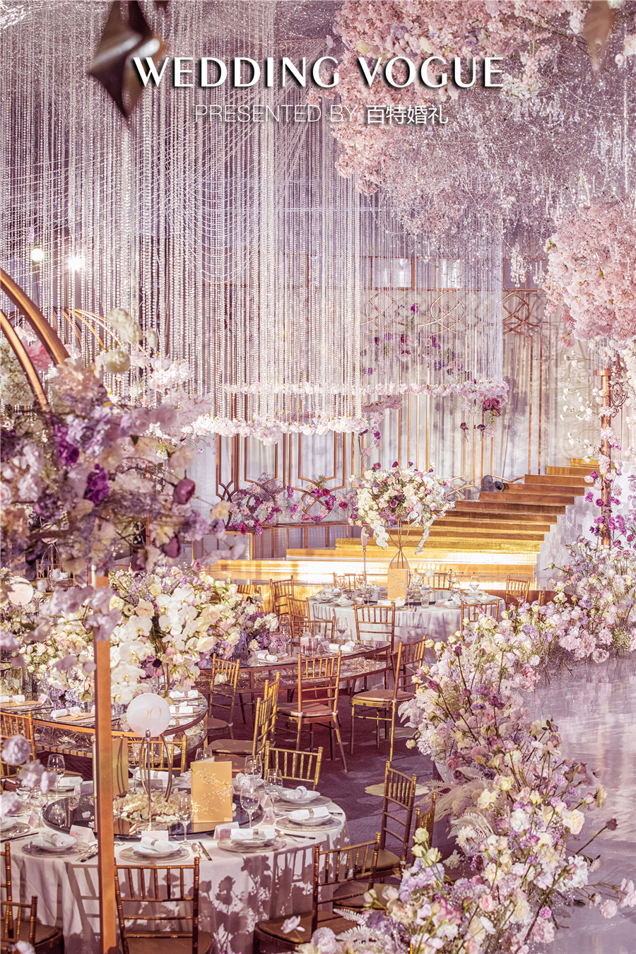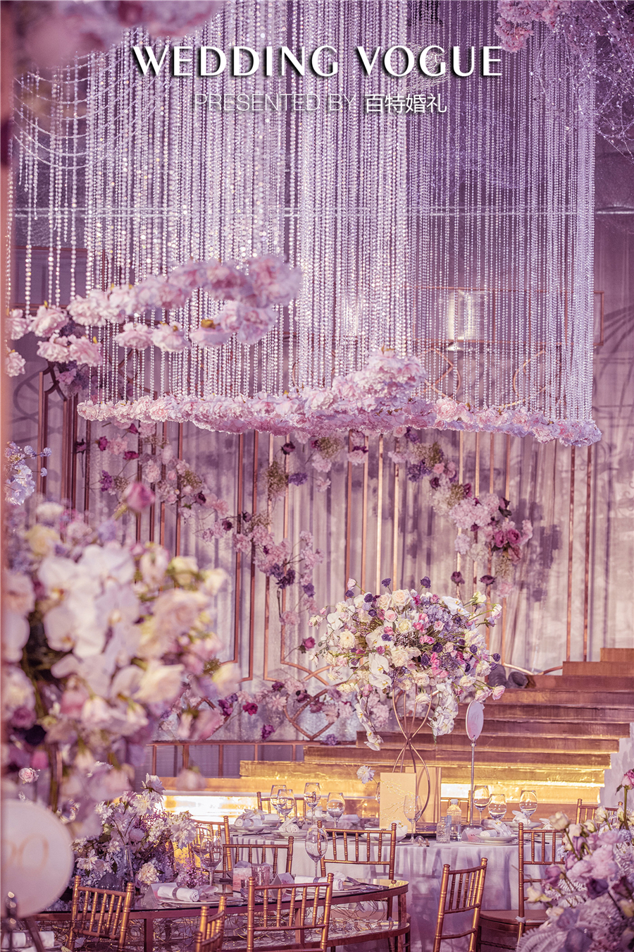 透明的水晶链与紫色花朵的结合,素雅清新中又不失少女的优雅,水晶链反射的璀璨光芒,加以满满仪式感的旋转楼梯。
