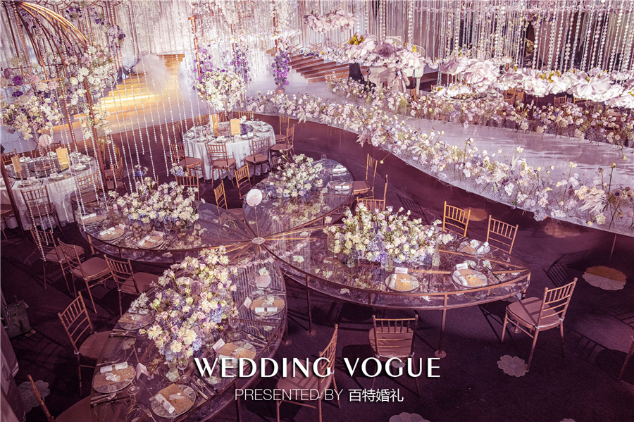 宾客主桌的造型也有一层含义,四张桌子的摆放组成一朵花的形状,与宴会厅空中水晶帘的花瓣形状相呼应,使得婚礼更具观赏的艺术性。