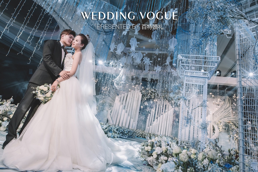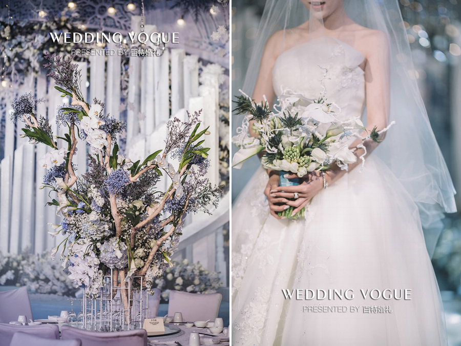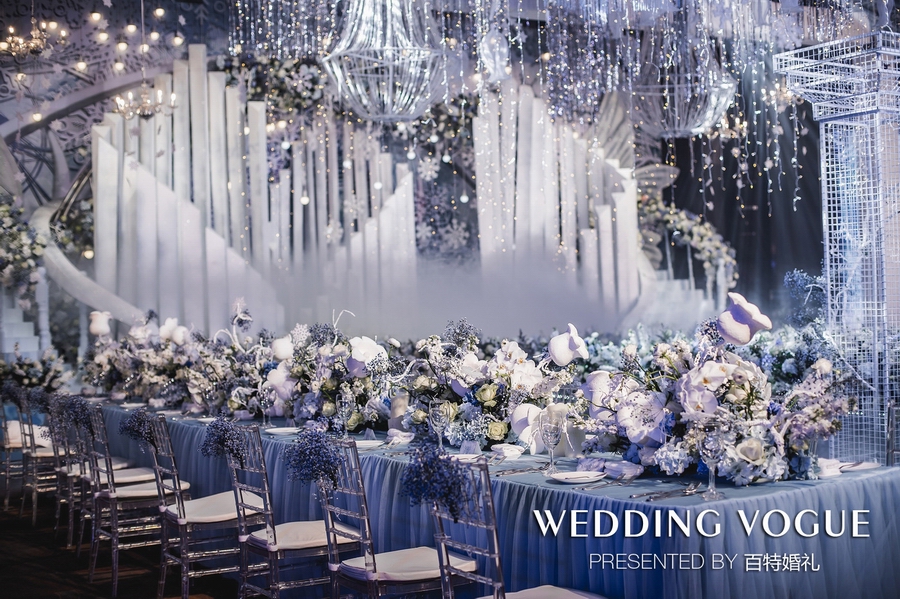对于婚礼,新娘喜欢蓝色,她说那是天空与海的颜色,自由又心安。百特婚礼设计师在了解到他们的故事之后,决定将他们的婚礼打造成一场冬景。