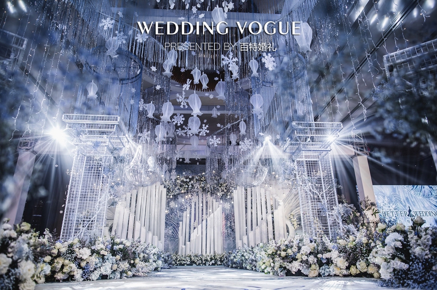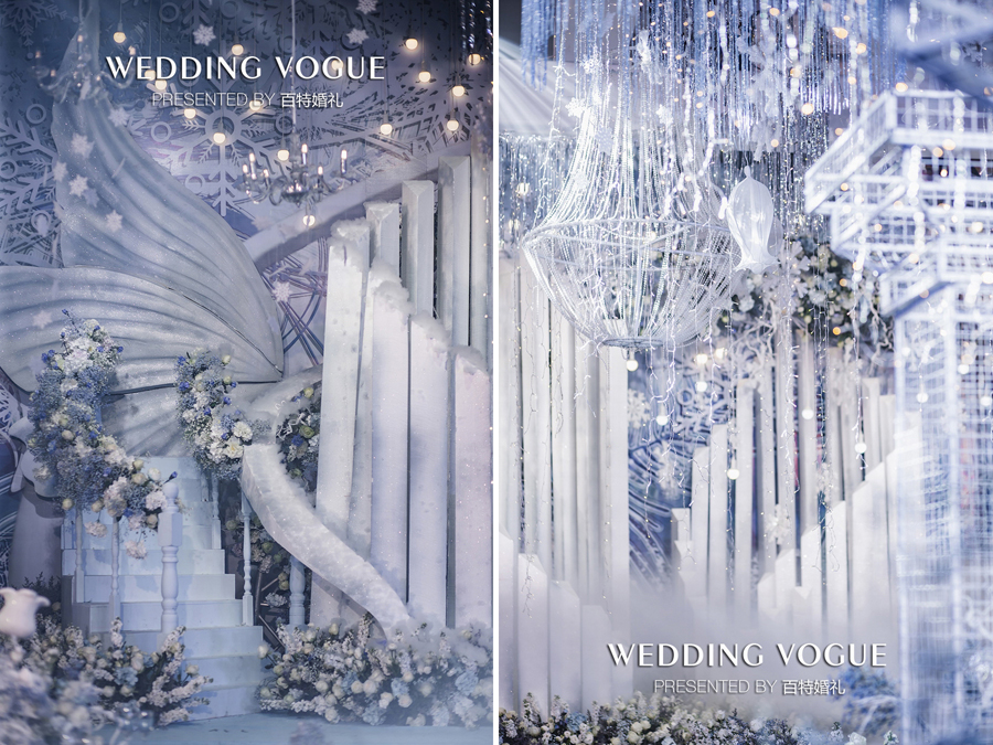 于是百特婚礼在婚礼仪式区设计了各式雪花工艺品、被雪覆盖着的花枝、冰柱,合影区使用透明亚克力方盒来演绎结冰的状态,点缀新人喜爱的满天星于其中,赋予冰雪些许柔情。百特为了营造雪的实景,还在现场特意准备了雪花机,当仪式开始,雪花散落全场,撒盐空中差可拟。
