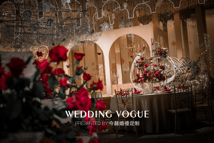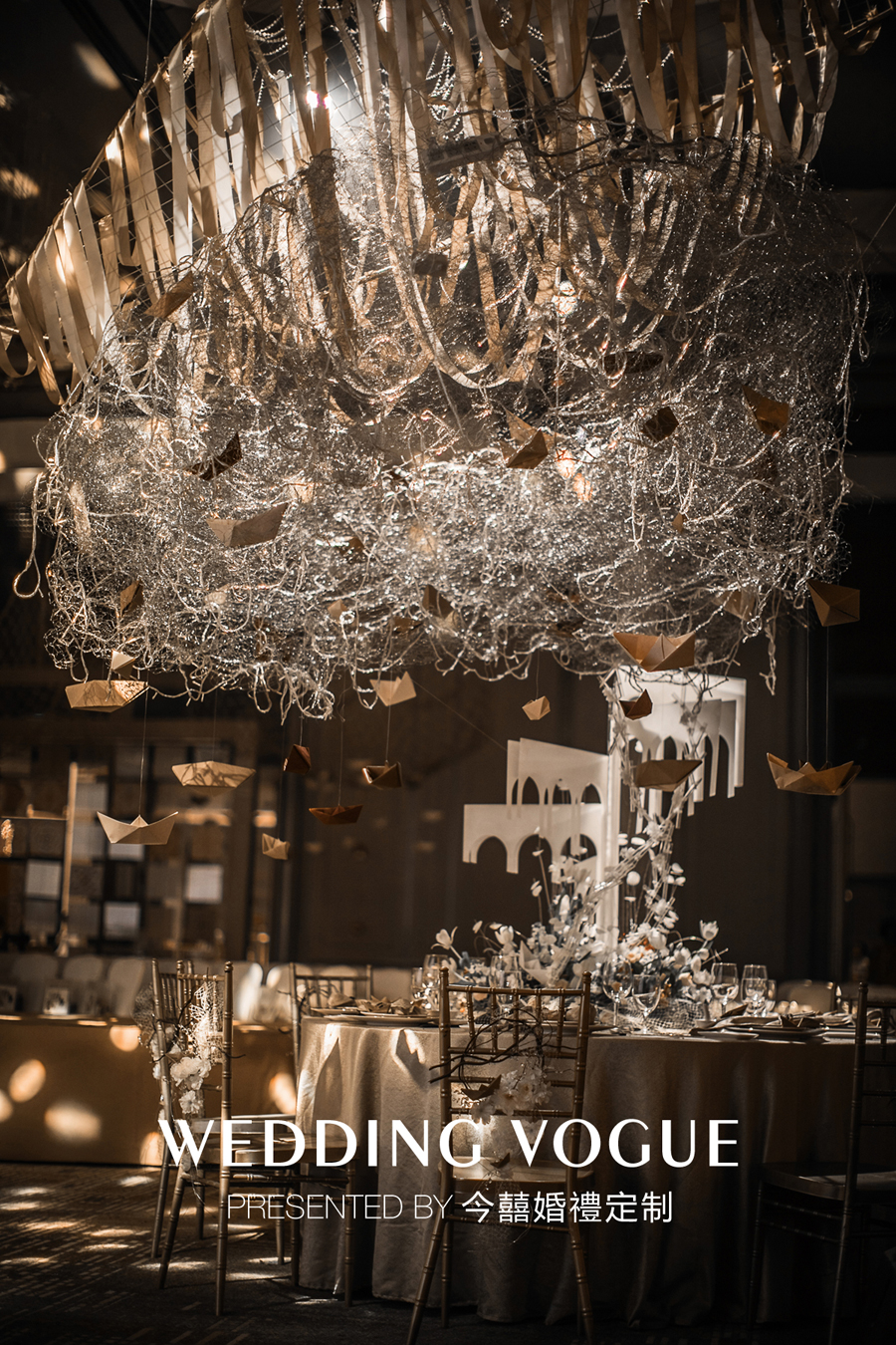 而整体吊顶部分是银河-海浪的演化,贯穿全场。现场五艘不同造型的船只也极具象征意义,其中四艘船只分别承载古铜、丝绸、瓷器、茶叶,体现海上丝绸之路,还有一艘纸船代表着婚礼人的初心与童真。
