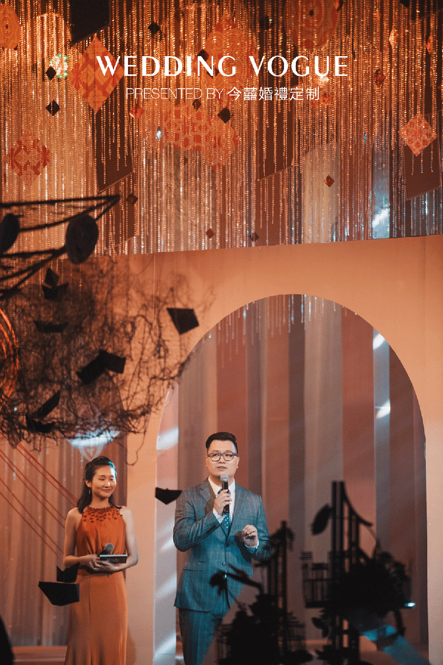 右侧为骑楼式现代风格舞台设计,骑楼为近代商住建筑,而泉州拥有我国仅有、保存最完整的连排式骑楼建筑商业街。今囍婚禮定制以骑楼为设计原型,错落穿插花砖元素,花砖曾是泉州地区人们显赫的身份象征,将这两者结合,体现泉州开放创造的精神与不可限量的商业潜质。