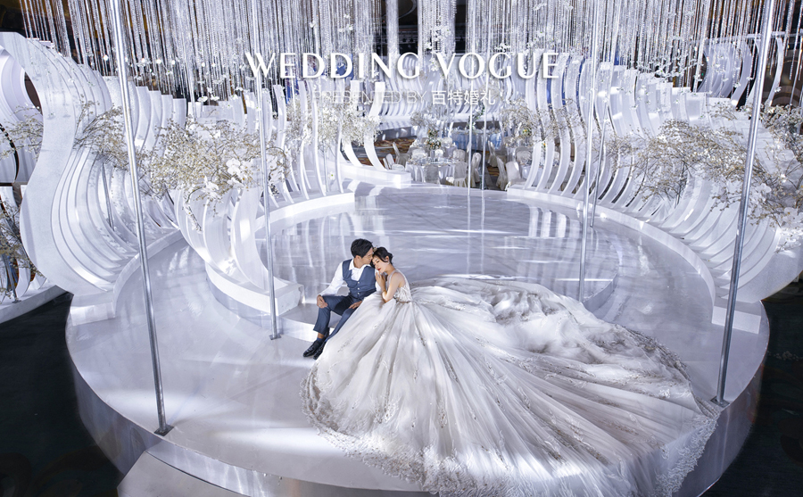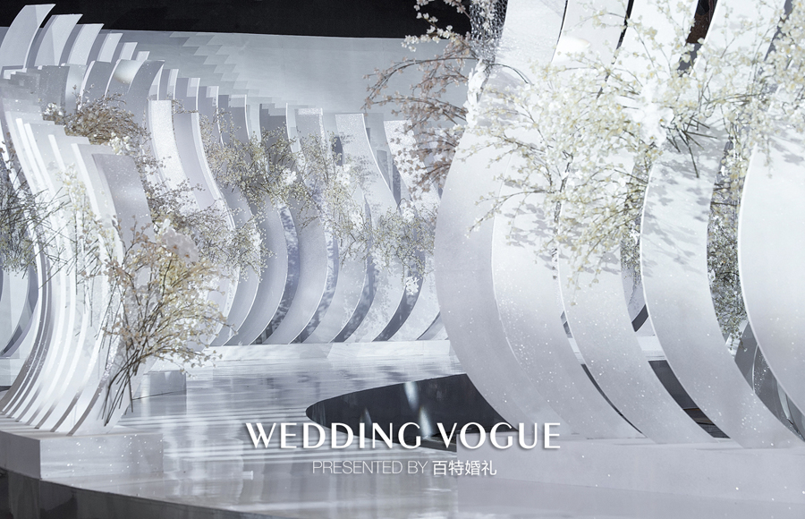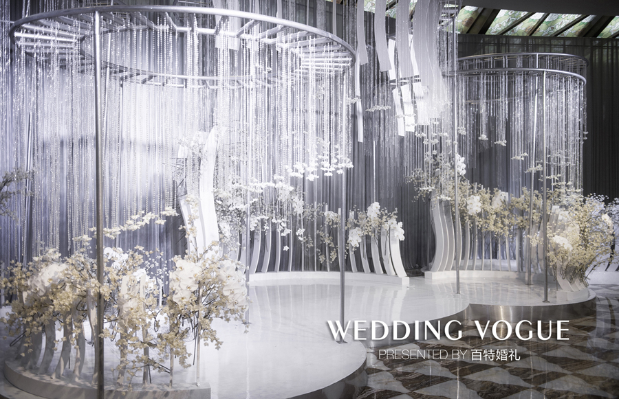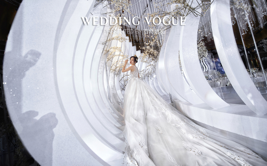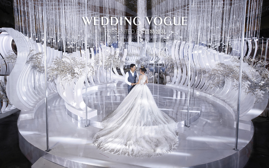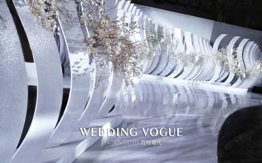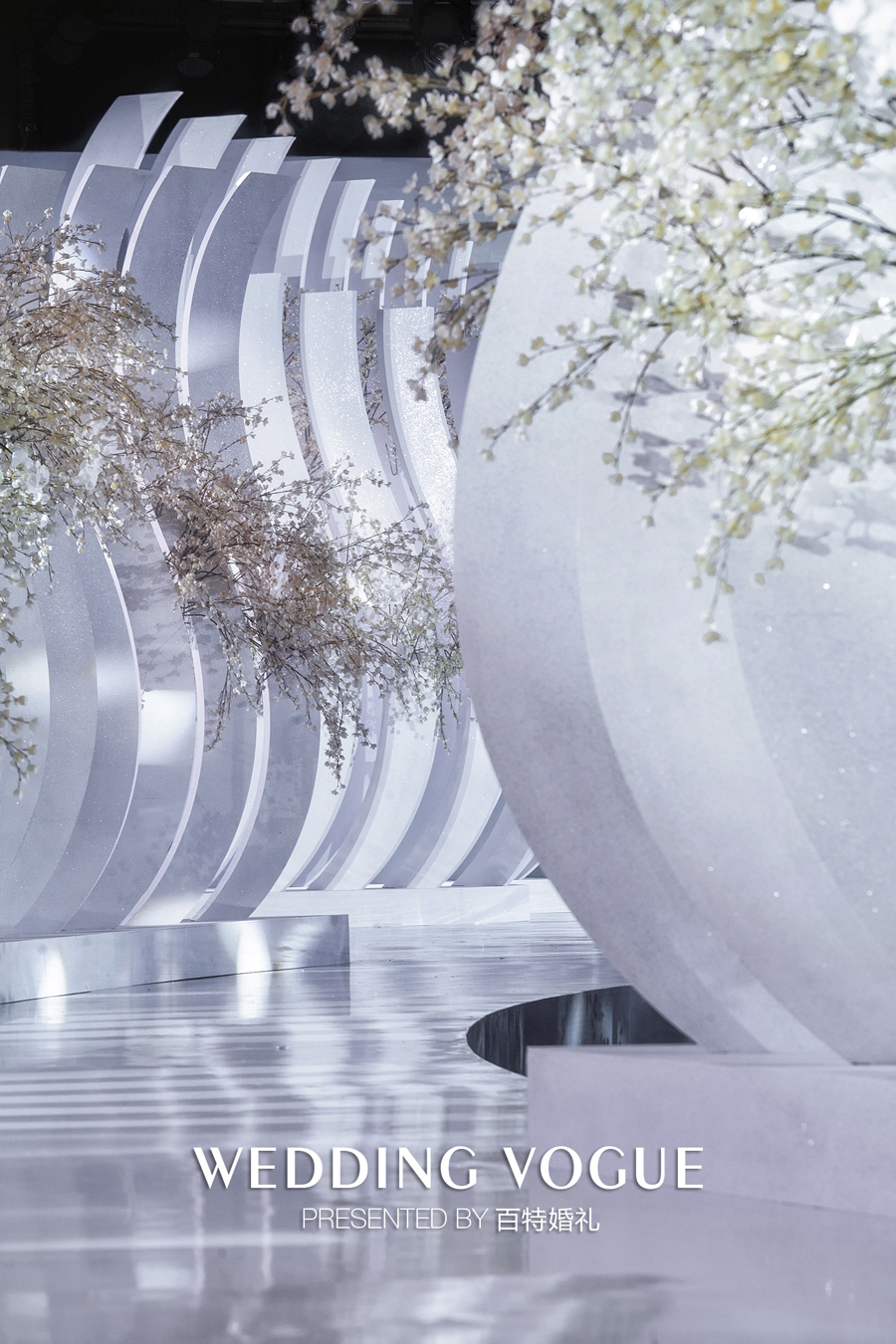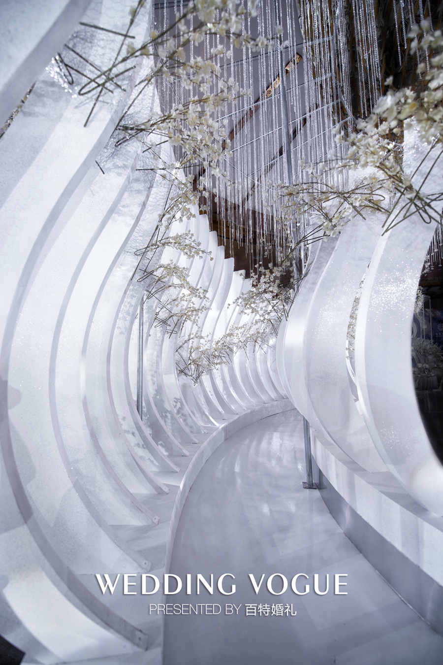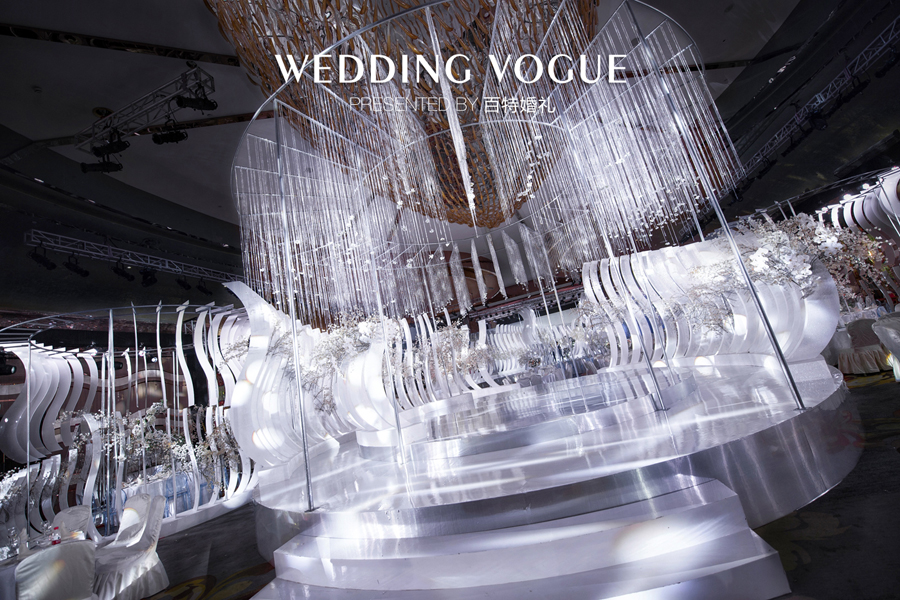 在光芒的诠释上,百特婚礼以流线型设计来表现光流动的状态。整场使用了大量极光板来作为反射光板,再利用灯光来进行染色烘托,极大程度地表现缤纷绮丽的光芒。而在整体氛围的营造上,随着灯光由蓝到白的斑斓与层次感,现场呈现一片迷幻梦境。