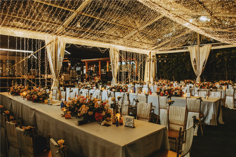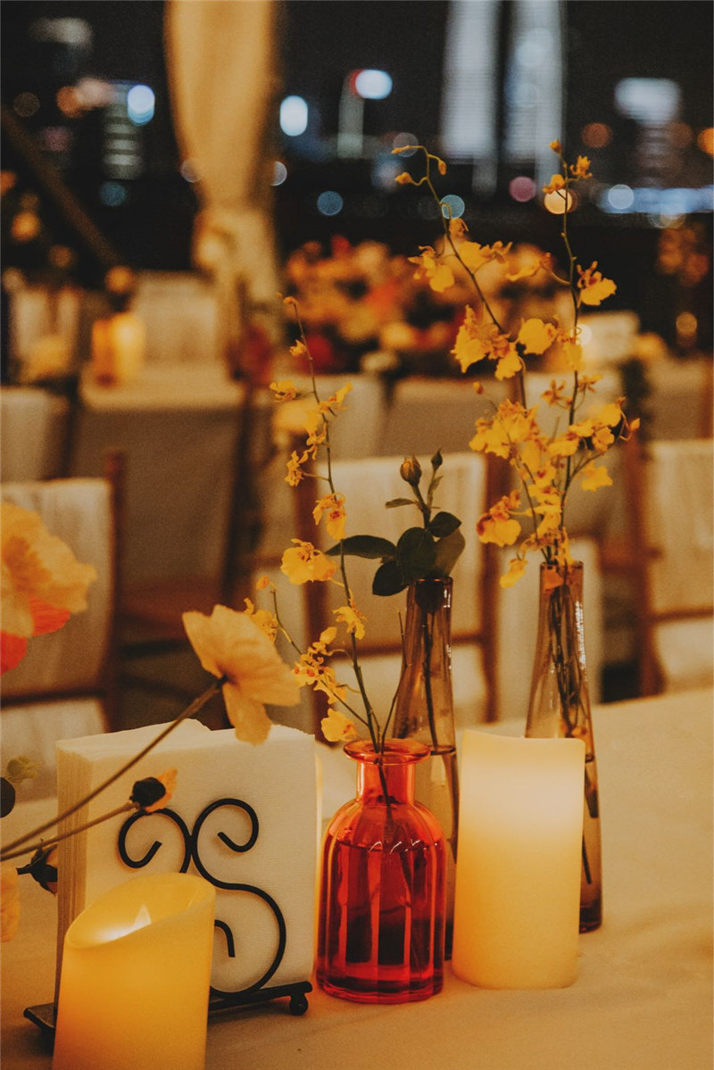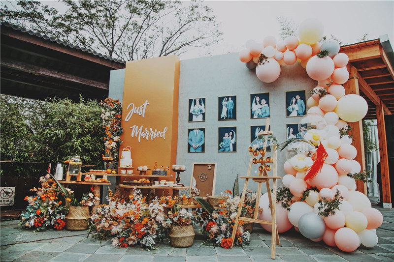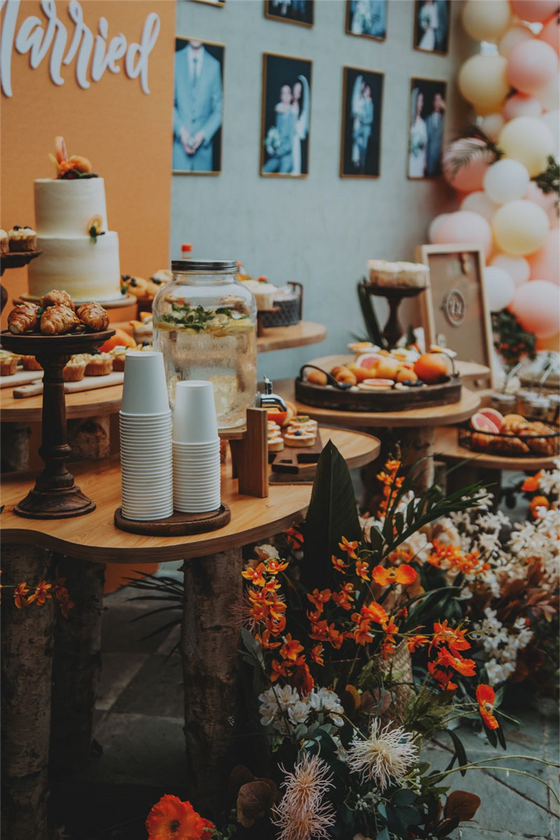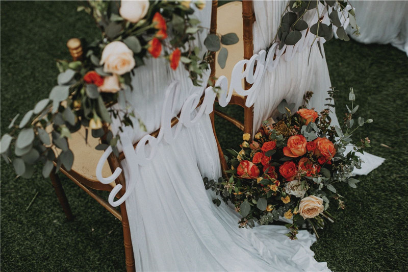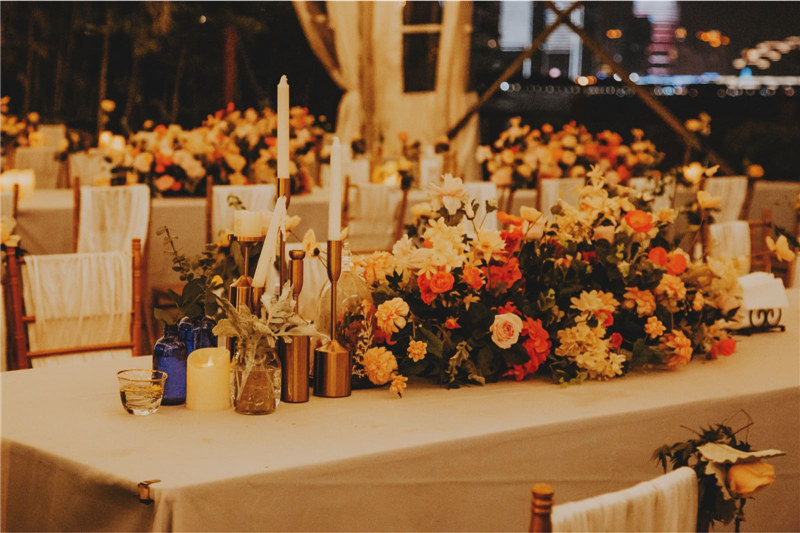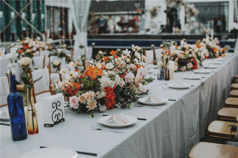 整个婚礼现场的色系以橙色、黄色为主要基调,花艺和金属质感的铁艺,搭配白绿色系,营造温暖清新,放松愉悦的氛围。