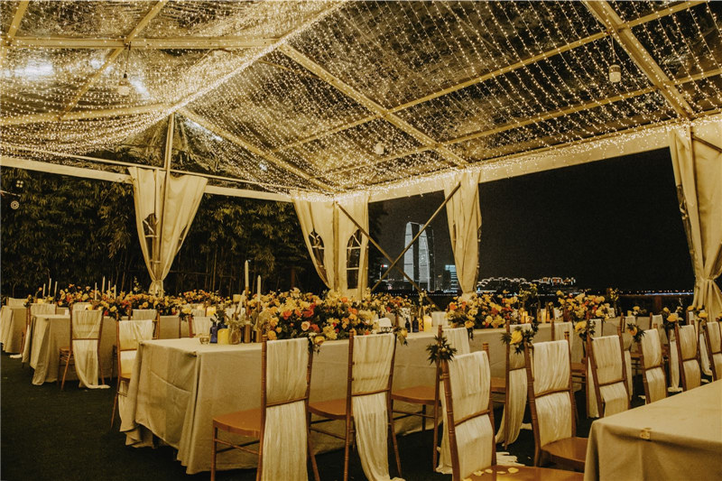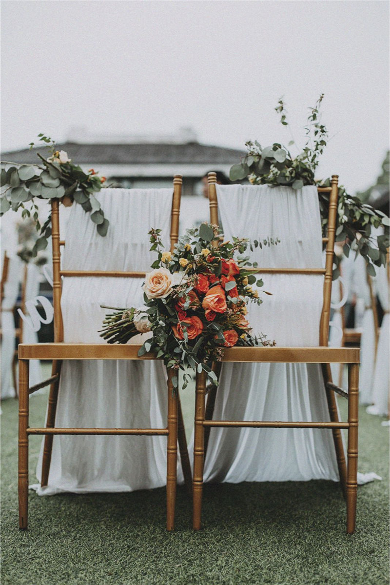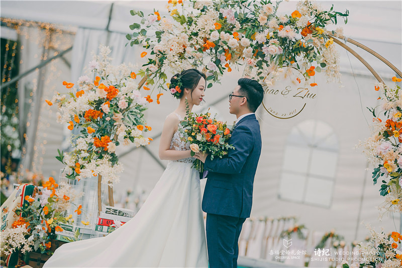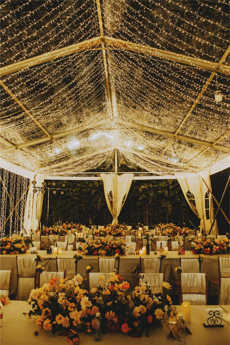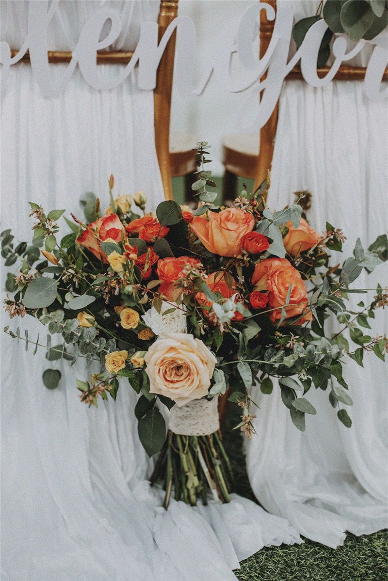 整个婚礼现场的色系以橙色、黄色为主要基调,花艺和金属质感的铁艺,搭配白绿色系,营造温暖清新,放松愉悦的氛围。