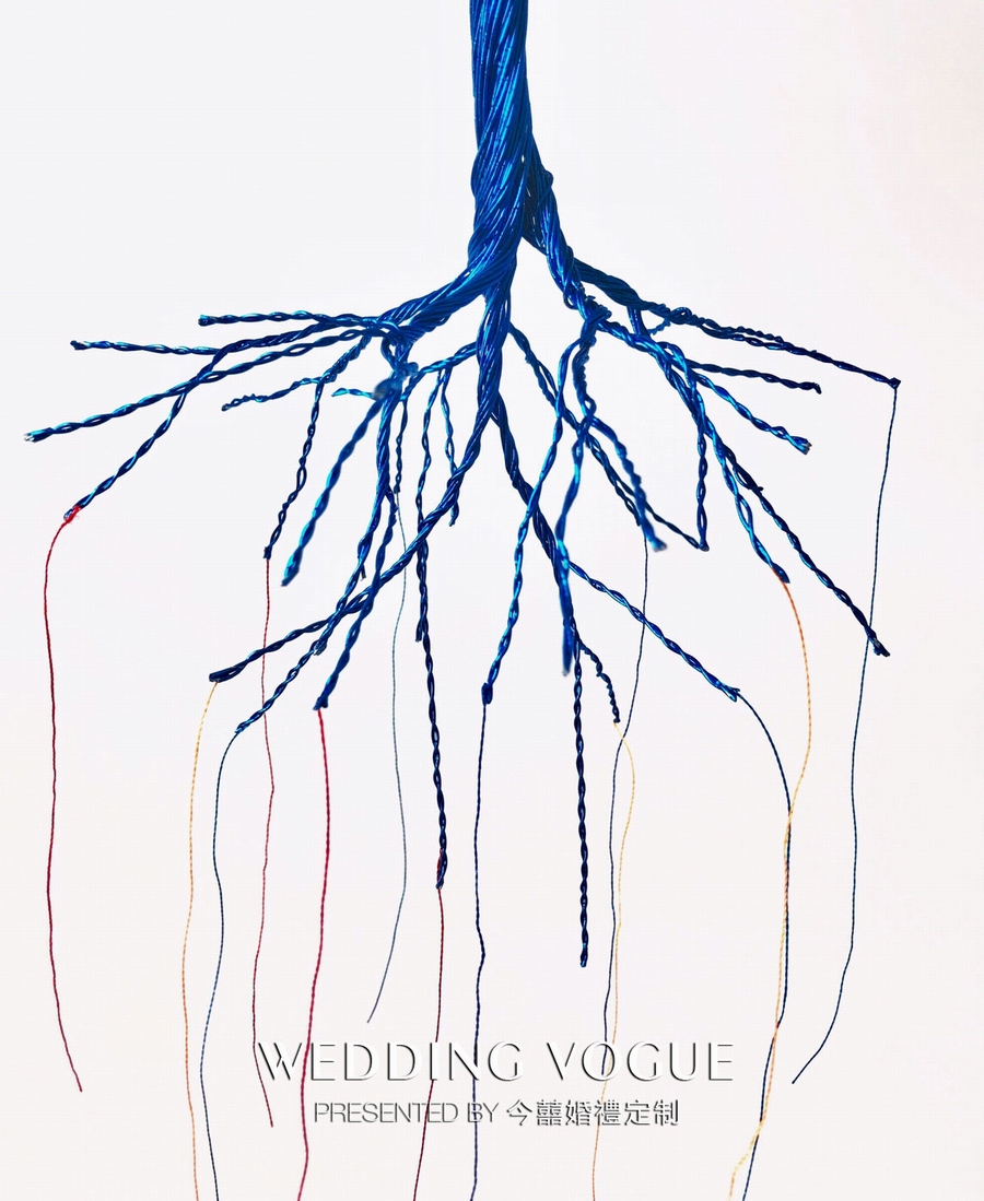 为配合婚礼主题的元素“树”,整个手捧造型化为罗曼蒂克的树状样式,融合了主题颜色,红蓝两色做渲染。