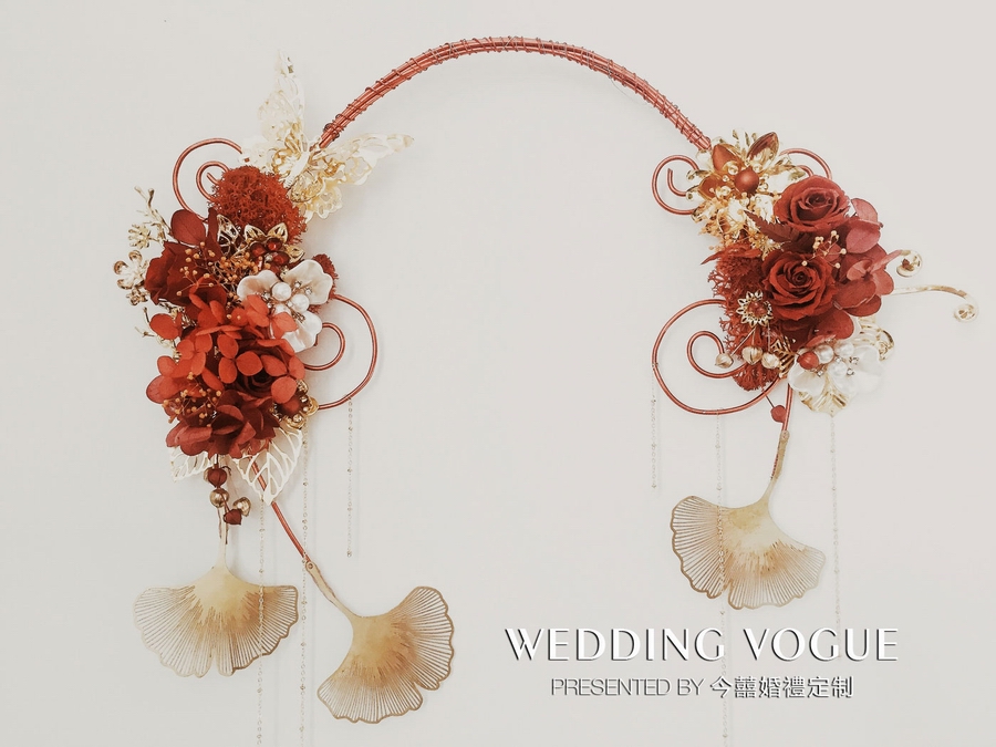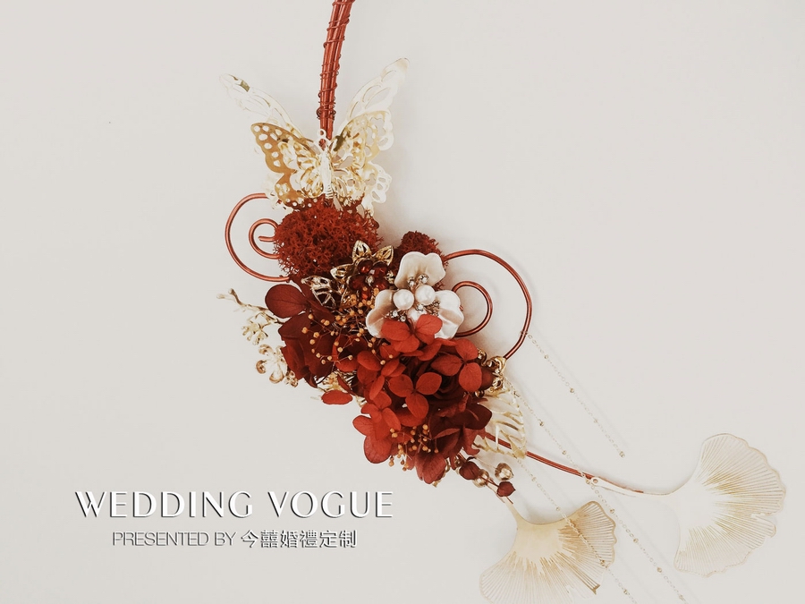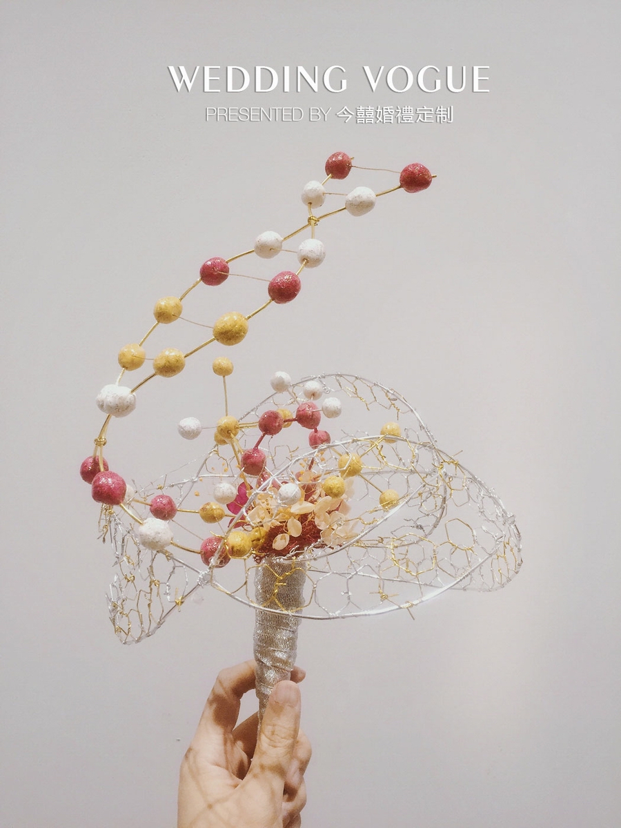 在手捧花的设计上,今囍婚禮定制也“里应外合”,从古到今结合婚礼秀的主题来打造。手捧花主打中式元素,融入古代元素,同时也引入西式手法和思想。