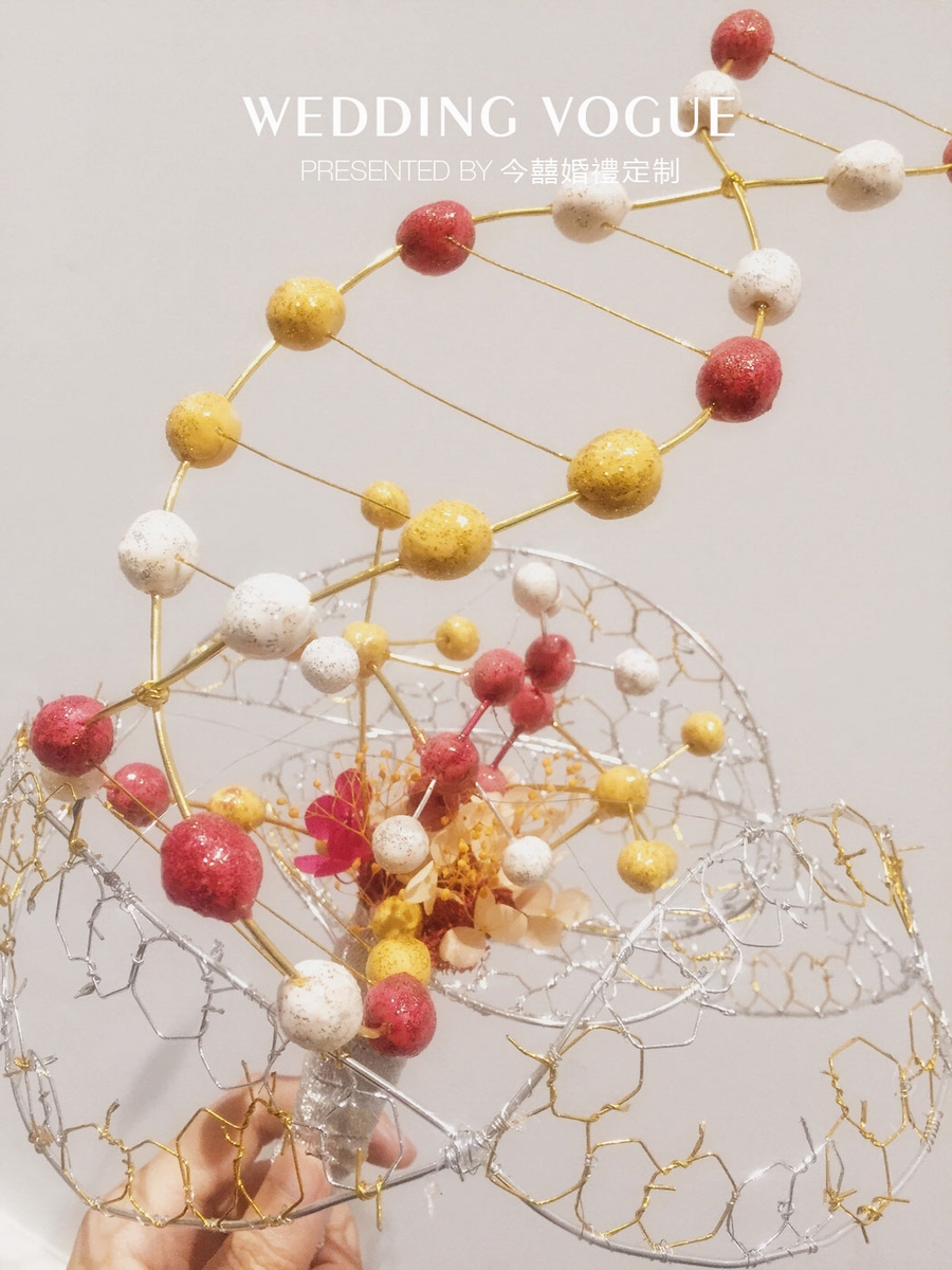 为了体现螺旋的造型以及打造轻盈感,在材质上策划师选用铁丝来制作构架。DNA分子则选用了软陶,在颜色的搭配上同步配合婚礼现场的布置。