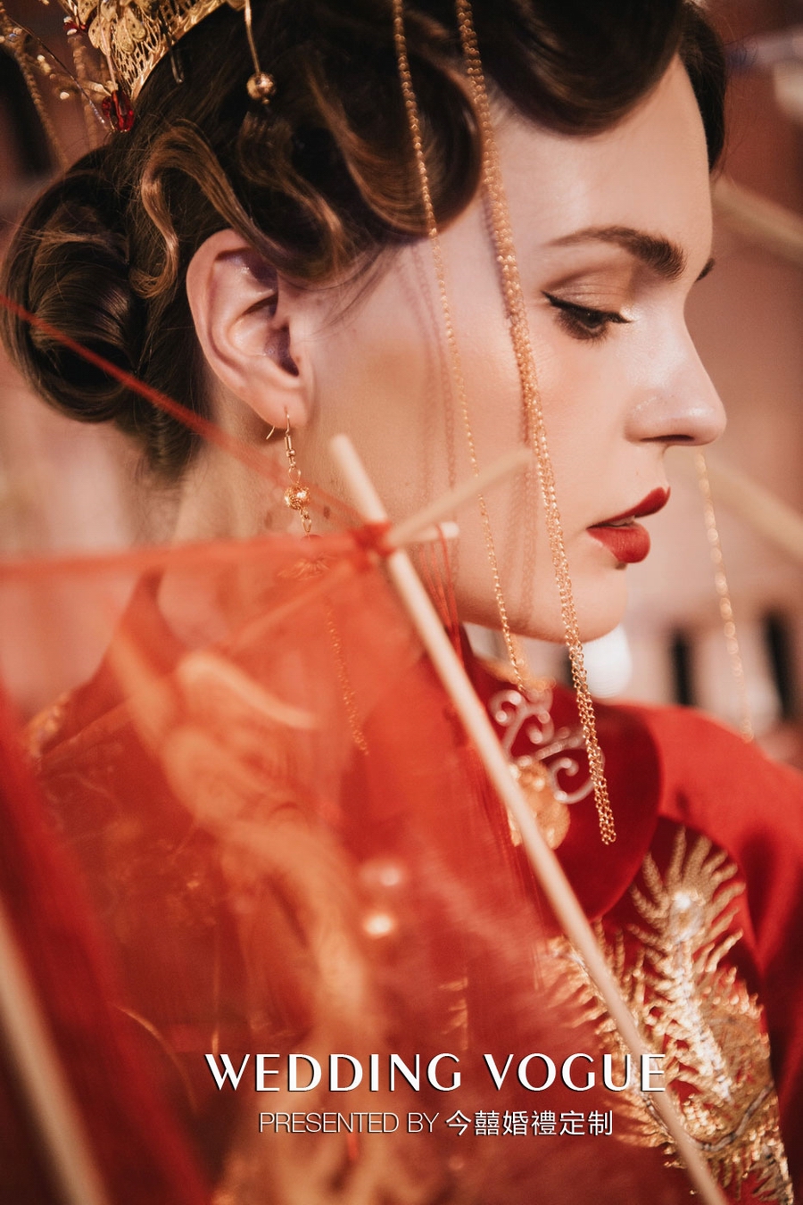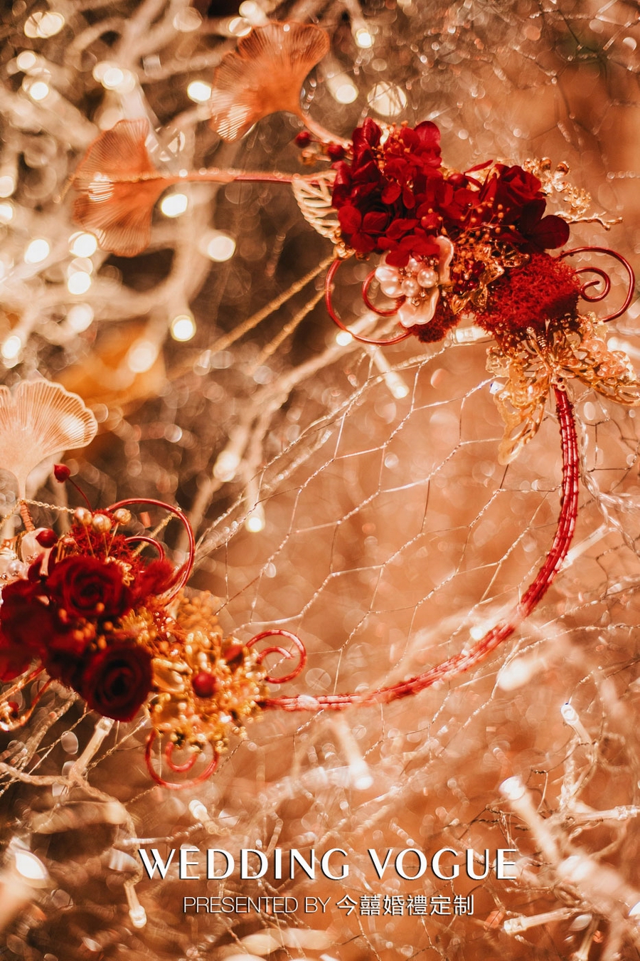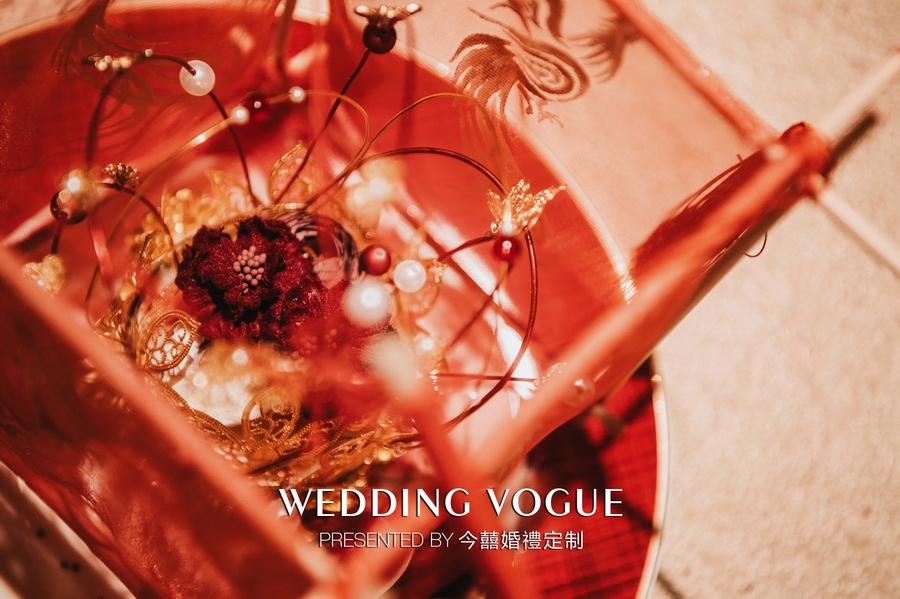 手捧的造型以灯笼为样式,四周使用半透明的红纱封住,打造出立体的矩形状。特别之处也是称为《凤凰来仪》之名的源头,即红纱上的凤凰图案,今囍通过金色颜料手绘呈现出凤凰,在框架内部则是手工的发冠造型,使得整个手捧造型丰满切题。