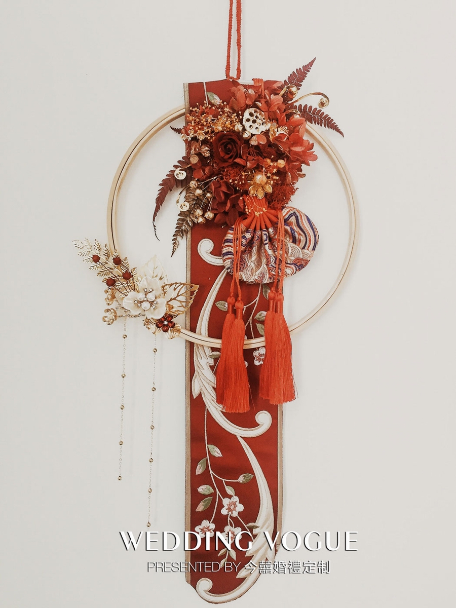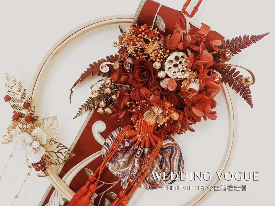 手捧的整个造型是手提式绣绷,融入了传统的荷包、刺绣织带等元素。“和合如意”在古代原是有荷、盒、灵芝组成,寓意和谐美好、称心如意。今囍婚禮定制取“荷包”以及荷花元素来命名。