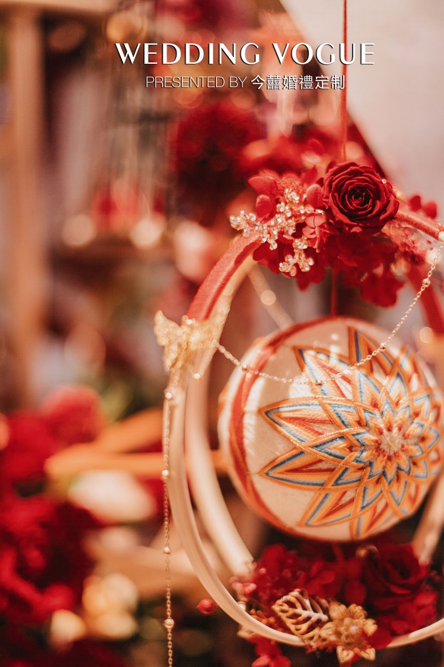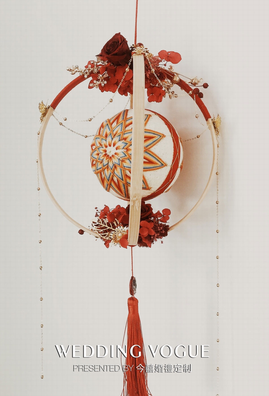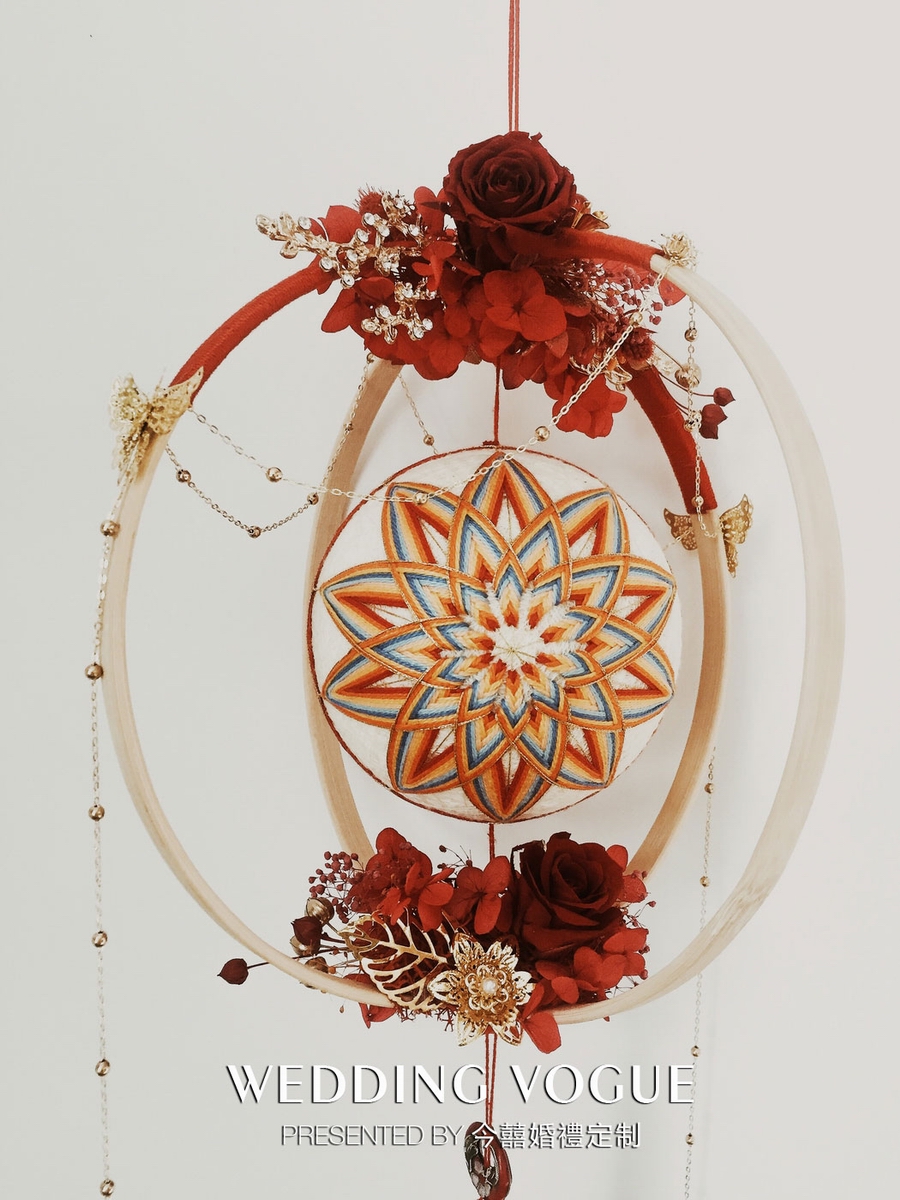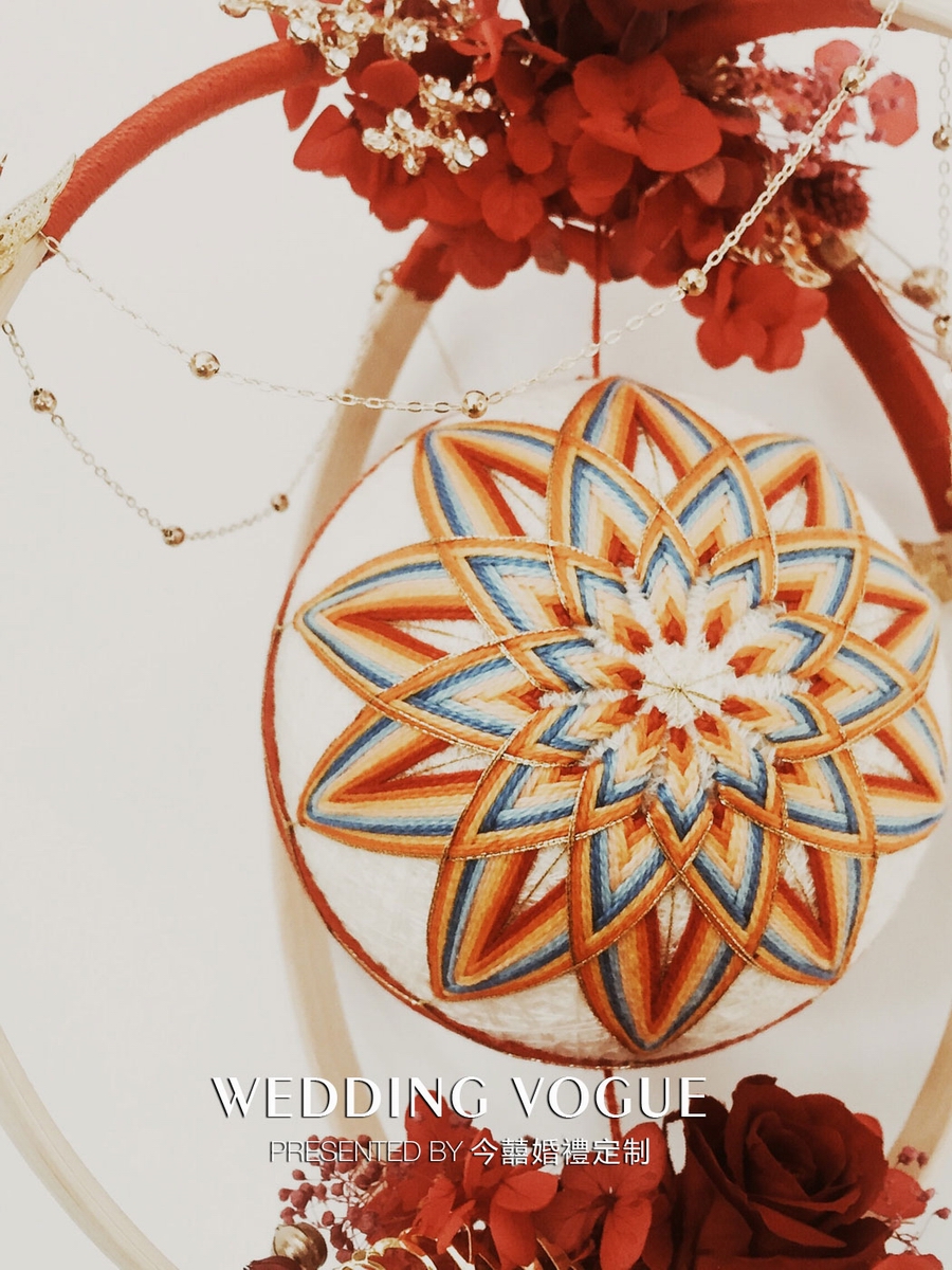 手鞠球是起源于唐代的一种传统民间手工艺术品,制作工艺复杂,基本上通过线的缠绕以及颜色的搭配就能呈现出非常漂亮的图案,寓以吉祥美好之意。在《泉·洲》婚礼秀的背景下,手捧花中加入手鞠球,既符合中式婚礼的元素,又有对婚礼美好祝福的寓意。