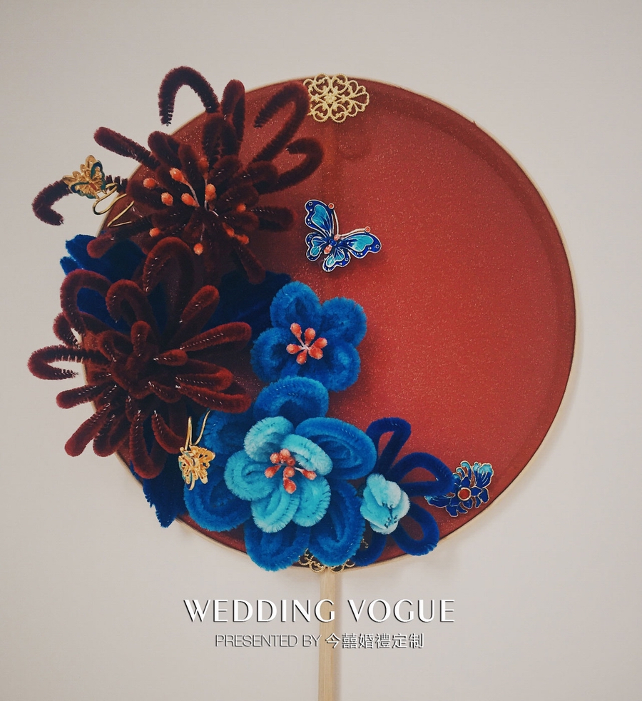 此款手捧区别于以往的中式团扇手捧花做法,主要使用毛根的原材料来加入仿绒花的元素。这使得整个手捧花更加具有传统韵味,也符合婚礼秀回归质朴中式婚礼的理念。