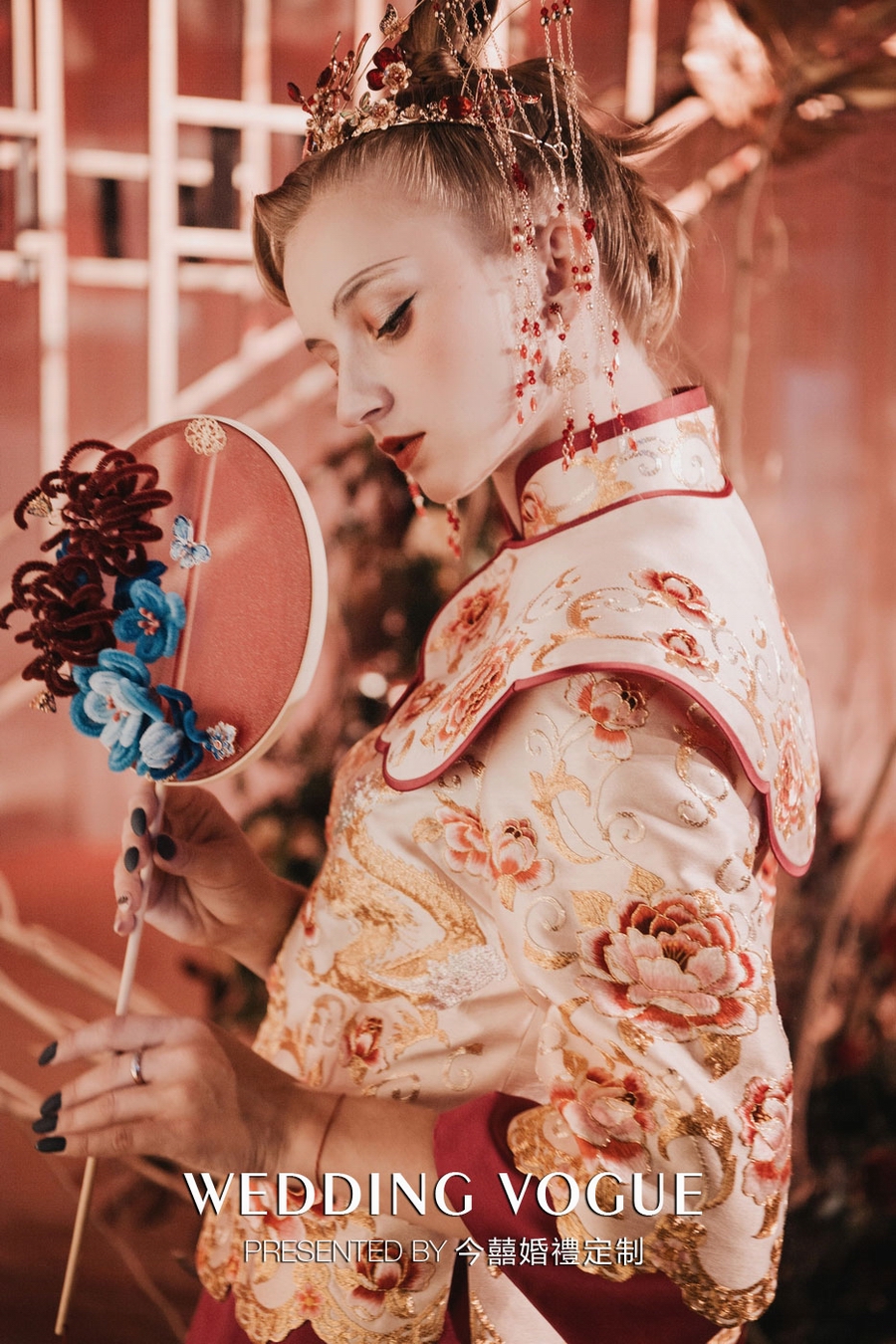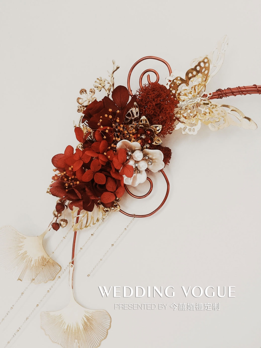 《簪盍良缘》有姻缘相聚之意。从造型上看,这款手捧是一个发箍样式。灵感来源于古代妃子发髻。在婚礼秀中有女子出嫁这一仪式,故今囍延伸出这一款手捧来贴合婚礼秀。